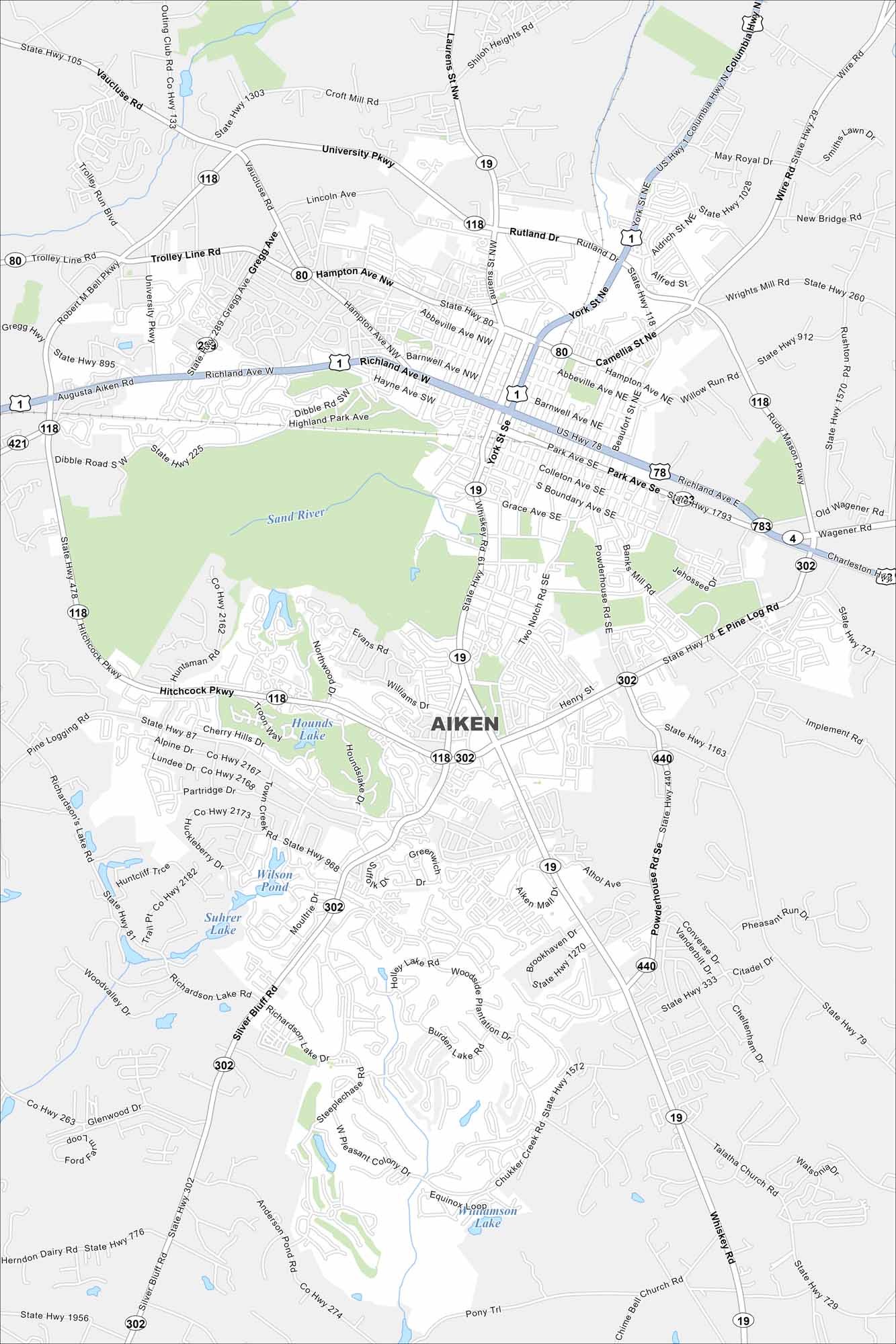 Our map of Aiken highlights its streets lined with parks and greenways. The city is known for horses and history. It’s set in the heart of South Carolina’s sandhills.