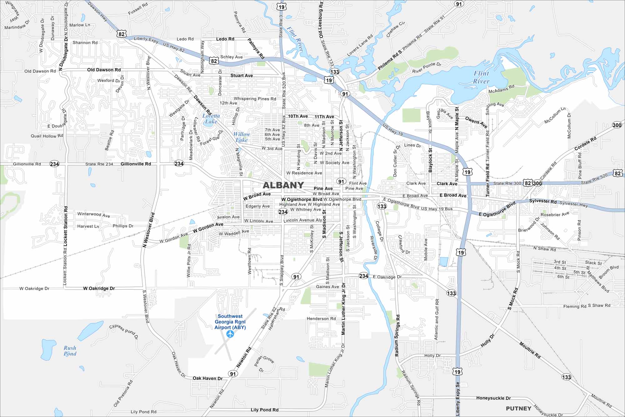 Roadways cross through Albany along the Flint River. Green spaces are also scattered around. Our map shows this South Georgia city known for its river heritage and ties to music history.