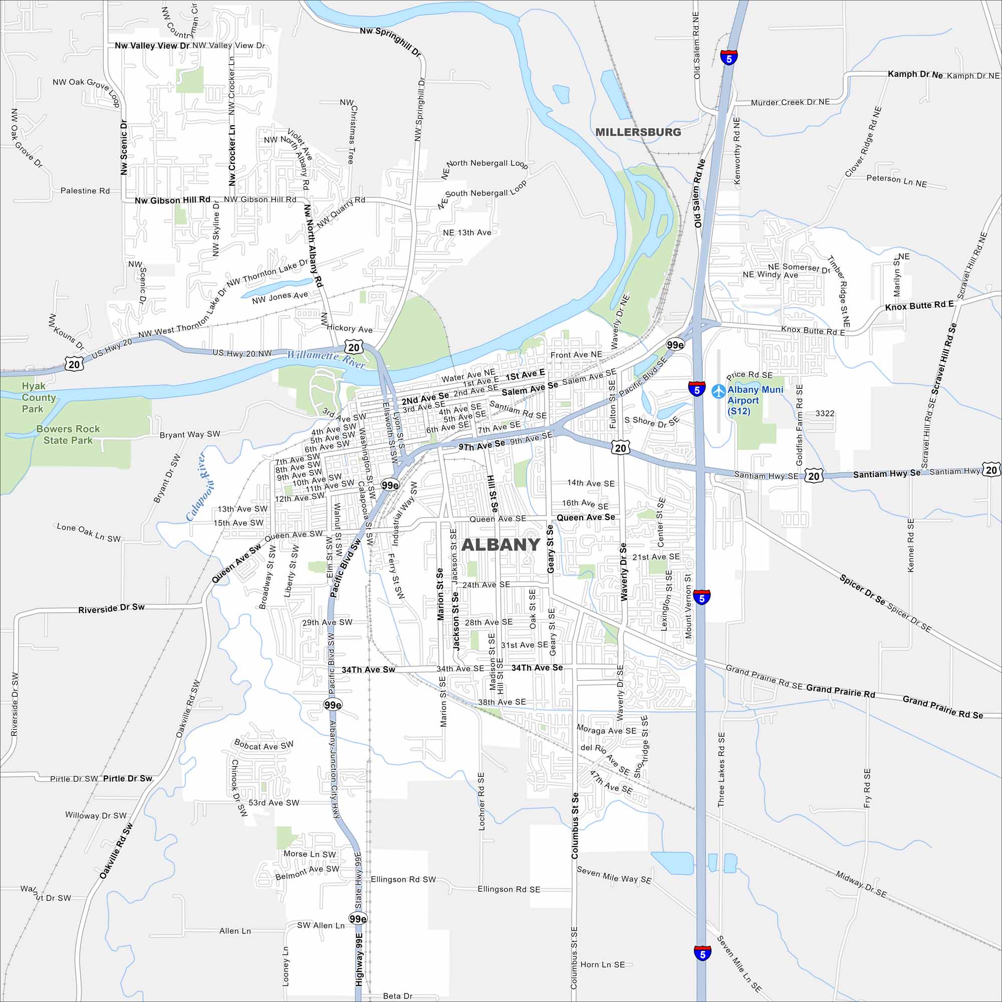 Our map of Albany shows how the city spreads across the Willamette River. Bridges link neighborhoods on both sides of the bank. Known as the “Hub of the Valley”, it has a weird type of small-town aura.