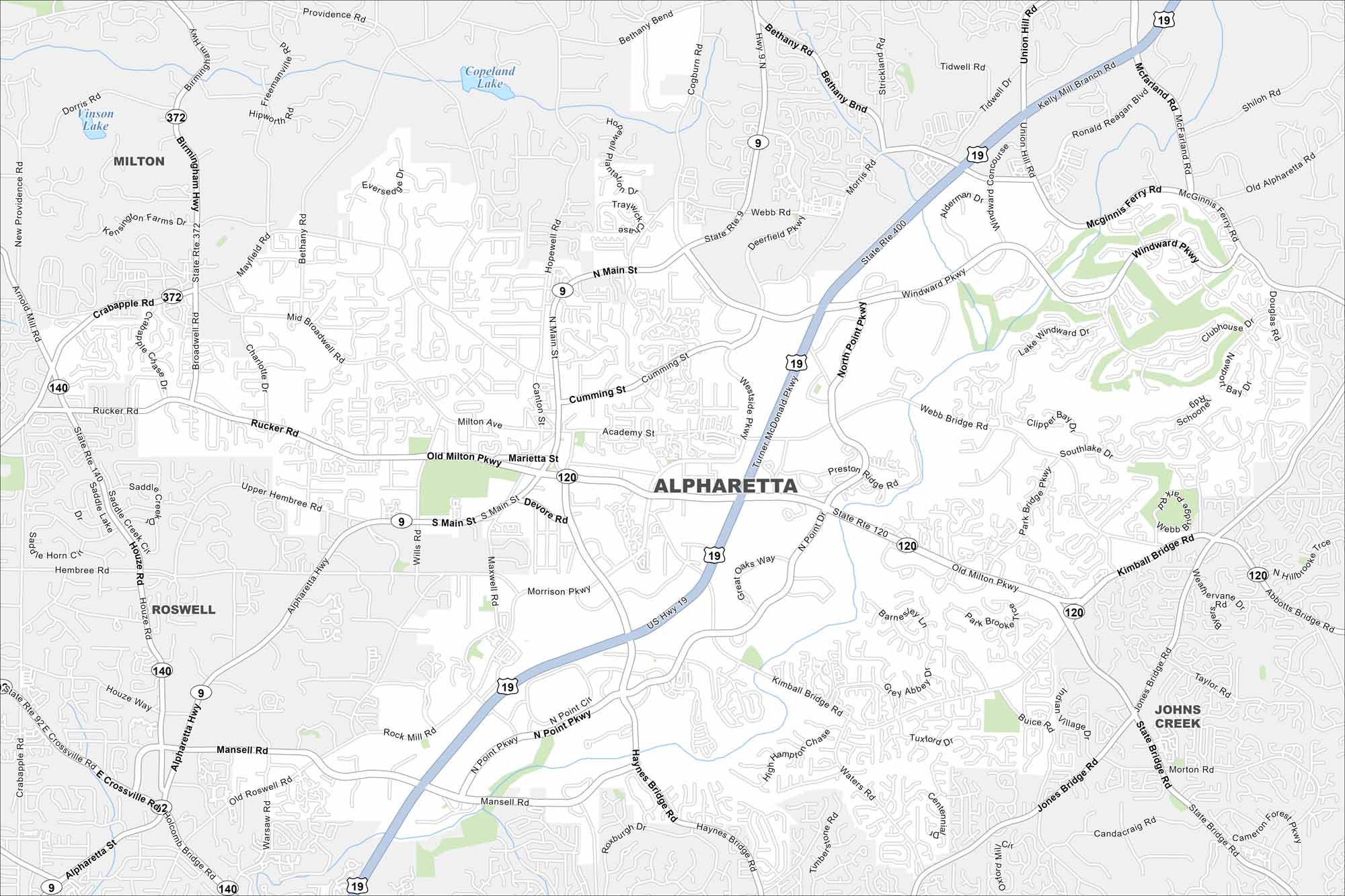 Here’s a fast-growing suburb north of Atlanta. Alpharetta has winding neighborhoods with major highways. It’s known for its tech hub and music venues. Use our map to show its highways and easy access to the North Georgia mountains.