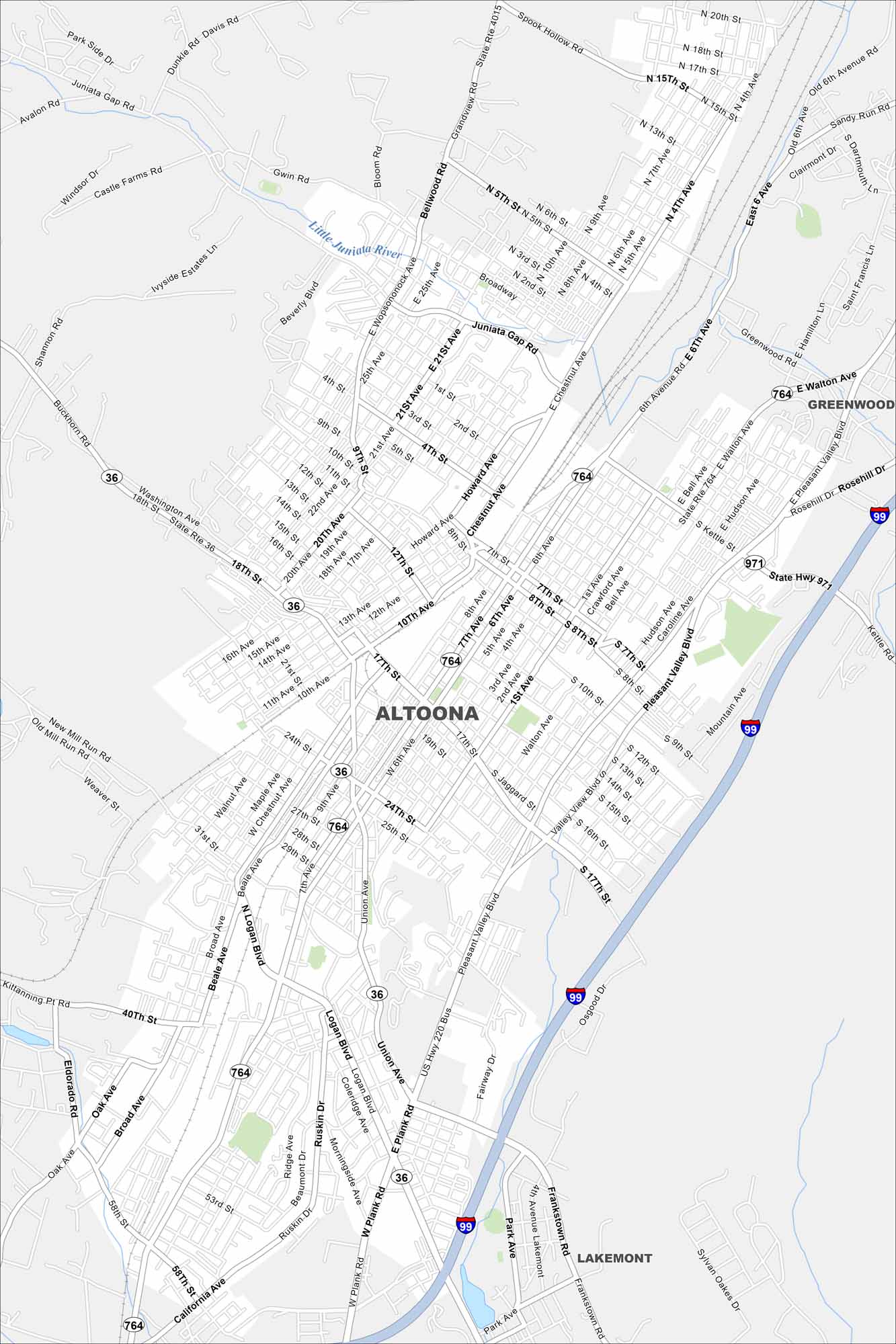 Built in the shadow of the railroad, Altoona spreads around the famous Horseshoe Curve. Streets wind through old neighborhoods on our map while highways cut through the Alleghenies.
