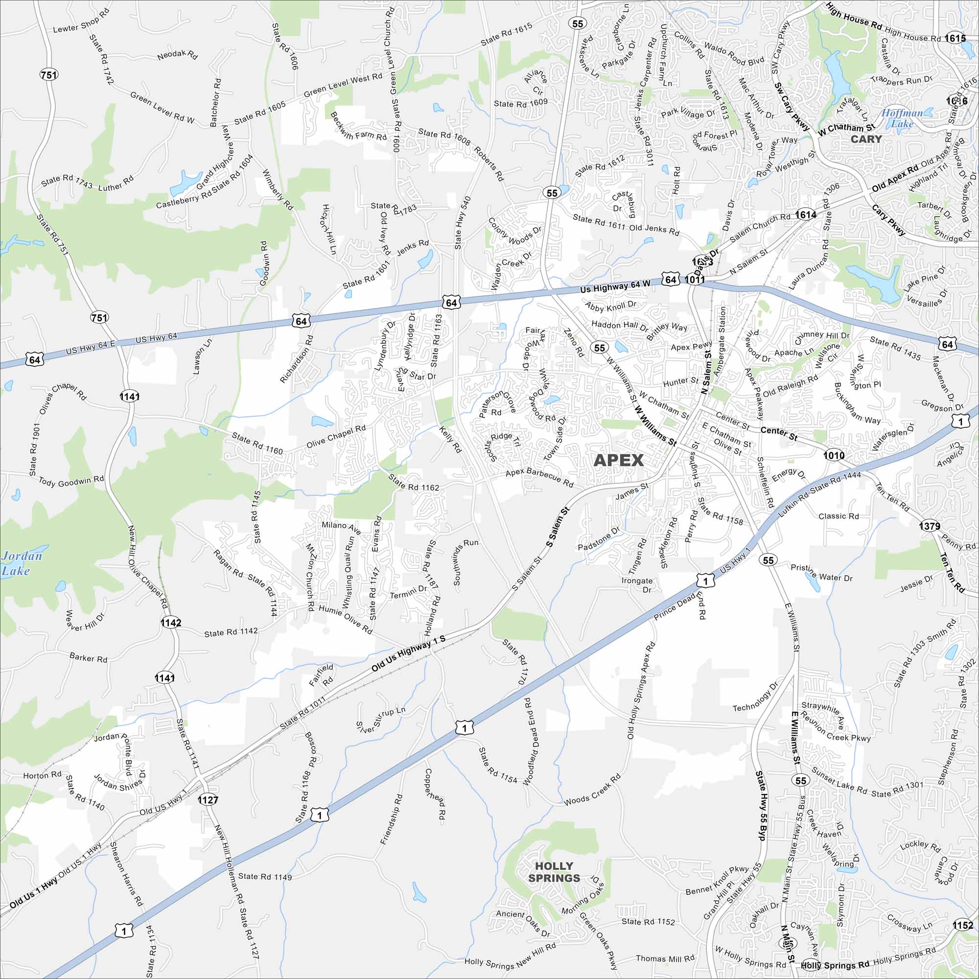 Our map of Apex shows its highways, rivers, and parks. Roads tie into Raleigh not too far away. Apex is also part of the Research Triangle.