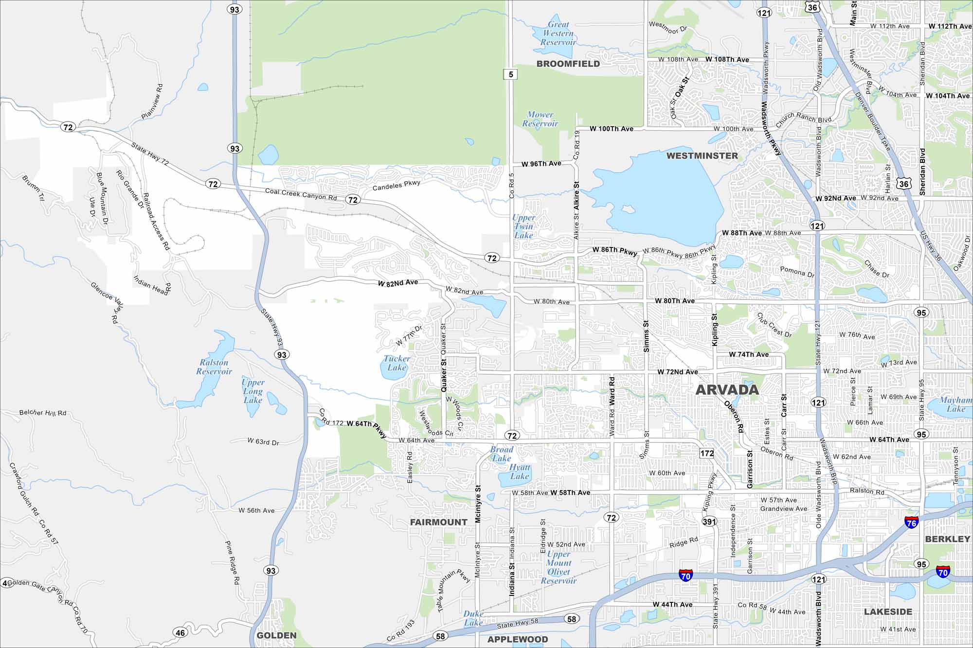 Arvada is located northwest of Denver. Our map of Arvada shows the roads, waterways, and park spaces. Streets connect to Denver.
