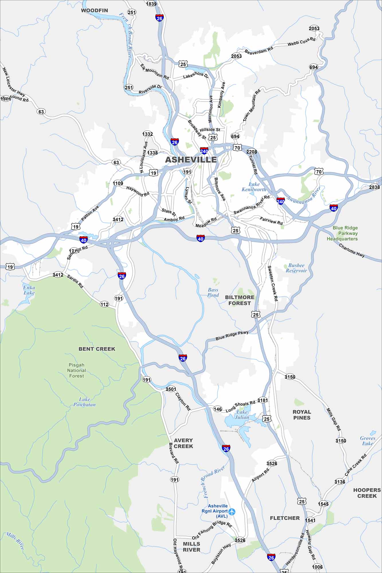 Asheville is mapped with its highways, streets, and riverside routes. Roads wind here because the city sits in the Blue Ridge Mountains. Asheville is known for the Biltmore Estate and mountain scenery.