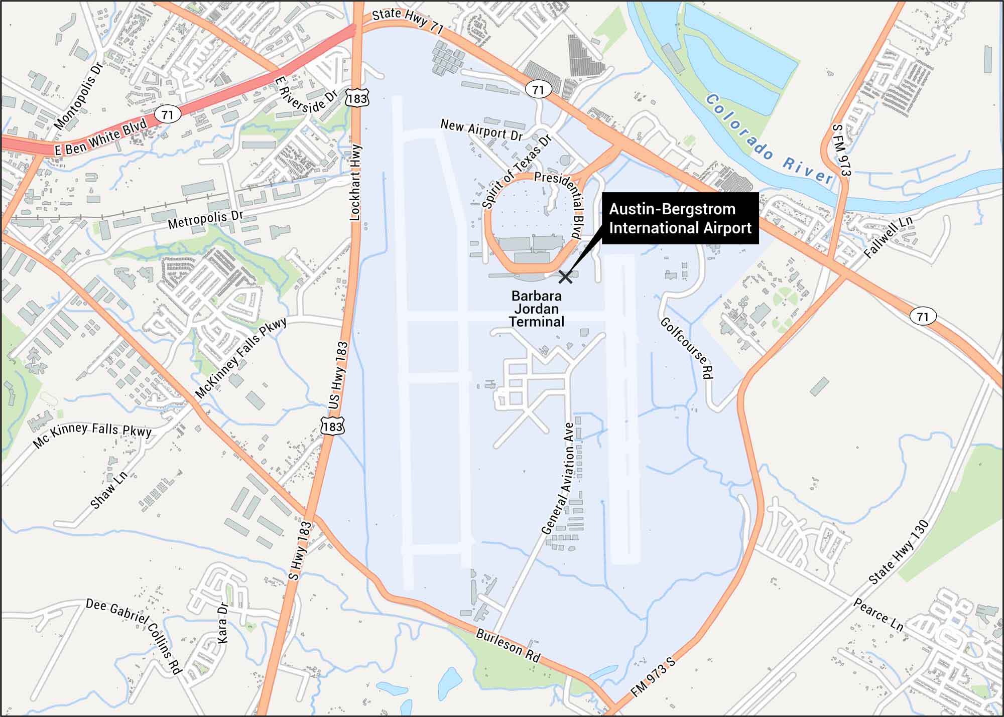 Our map shows the layout at Austin’s main airport. You can see highways, runways and the main terminal. The airport sits southeast of downtown off Highway 71.