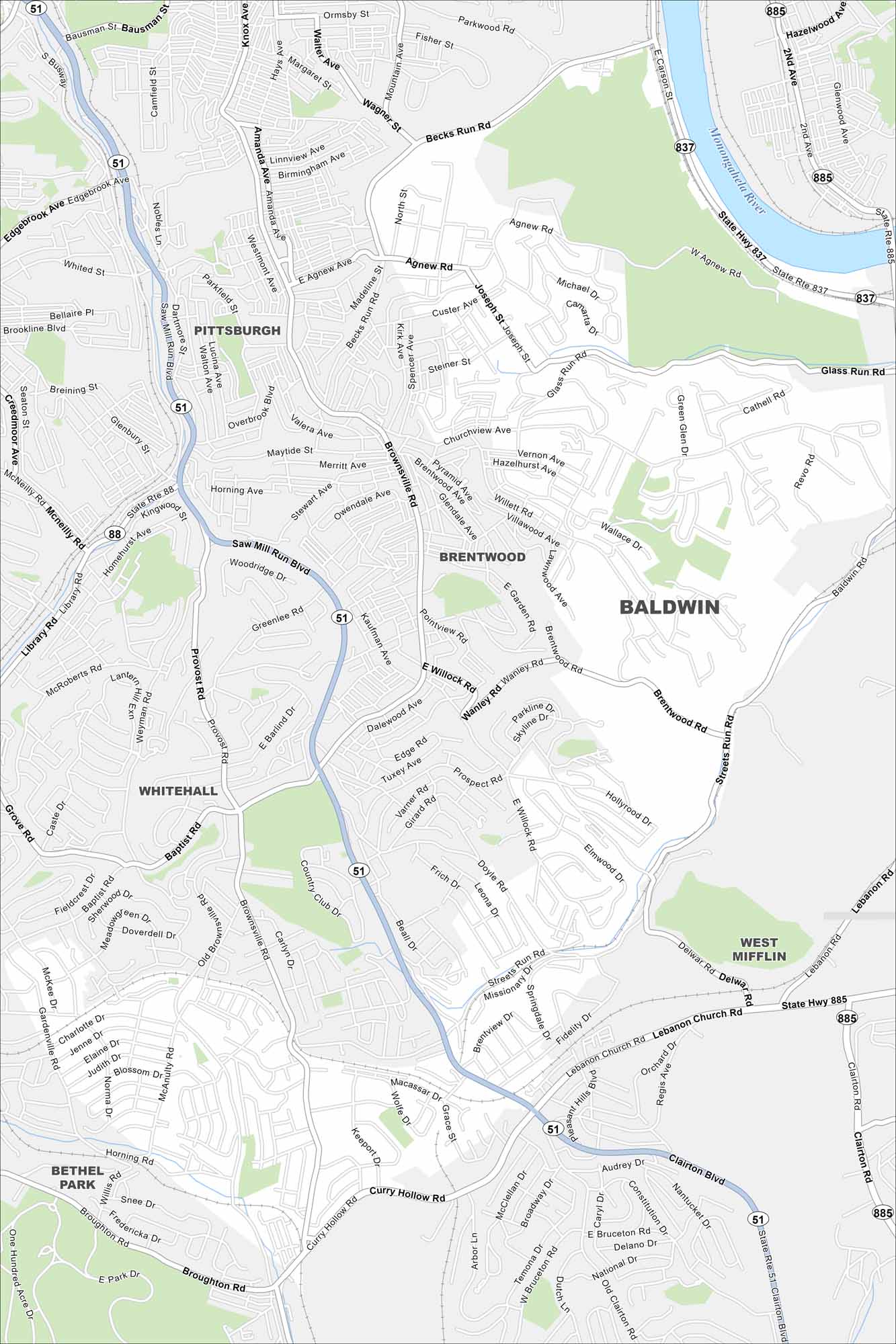We’ve mapped Baldwin Borough with its streets, highways, and green spaces. The major highways here connect into Pittsburgh. It lies along the Monongahela River in Allegheny County.