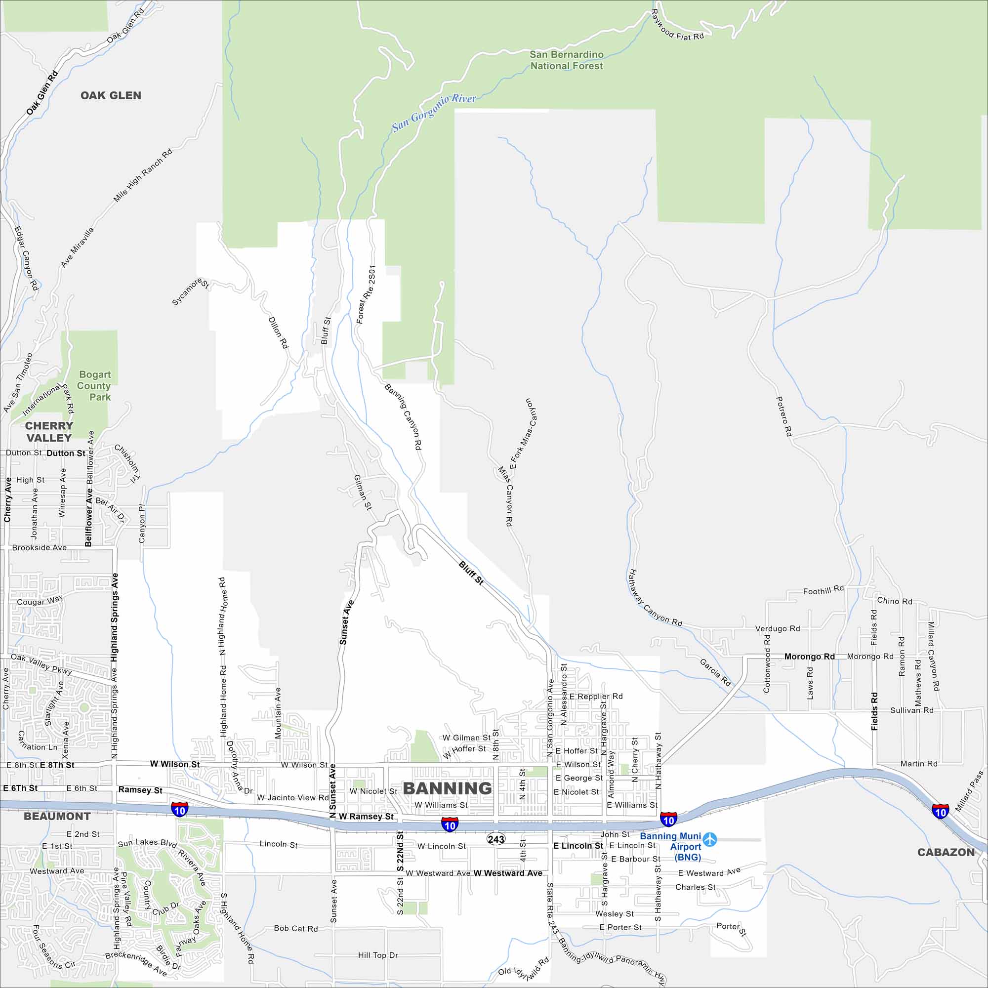 See the highways, streets, and mountain passes on this map. Our map of Banning reveals its place along the San Gorgonio Pass. The city is a gateway between the Inland Empire and Coachella Valley.