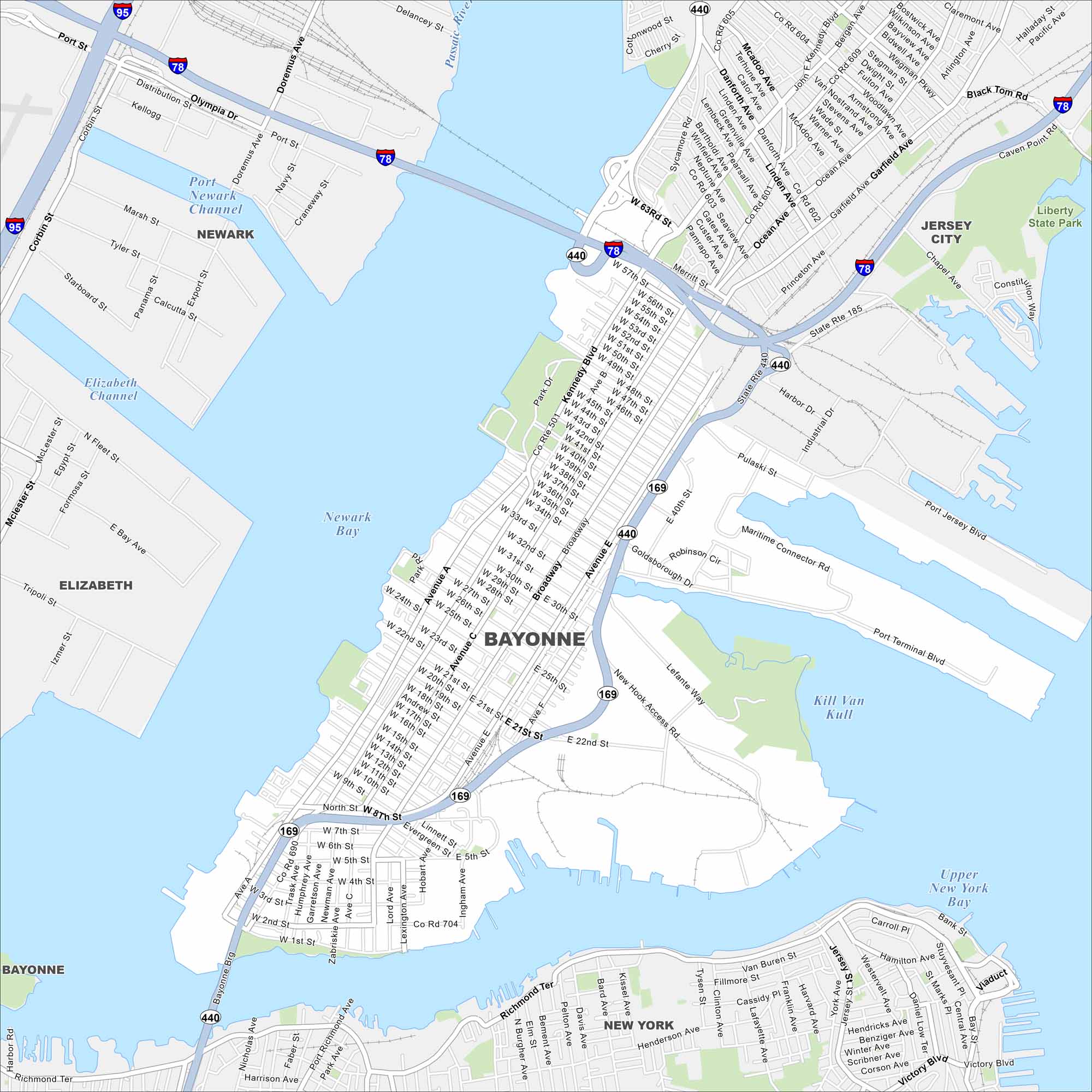 Bayonne is on a peninsula between Newark Bay and New York Harbor. Our map shows its waterfront, city grid, and connecting bridges. Its location makes it an important port and residential city near New York.