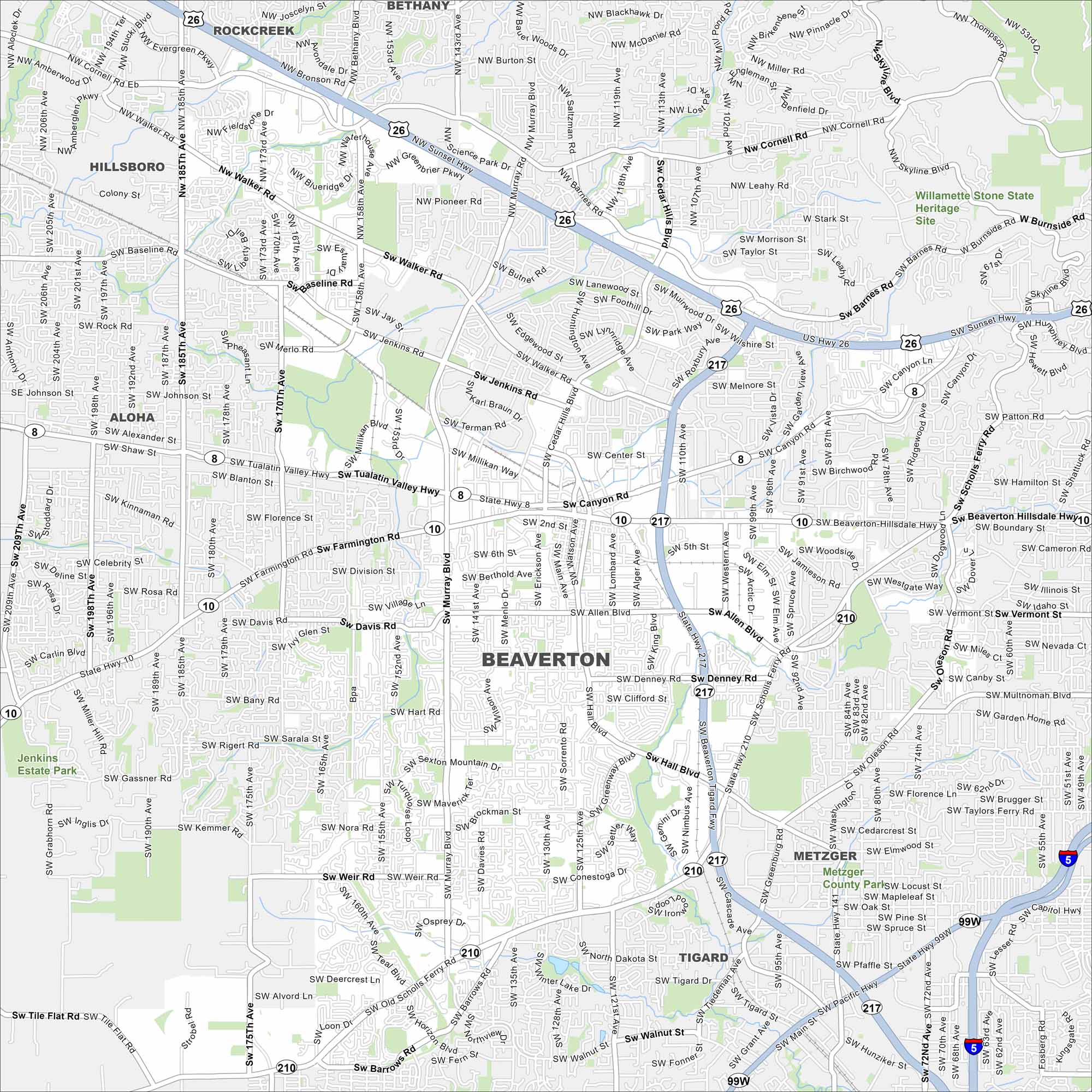 Get oriented with our Beaverton map. Close to Portland, our map shows its network of roads, parks, and railways. The city is known as a hub for tech companies and outdoor access.