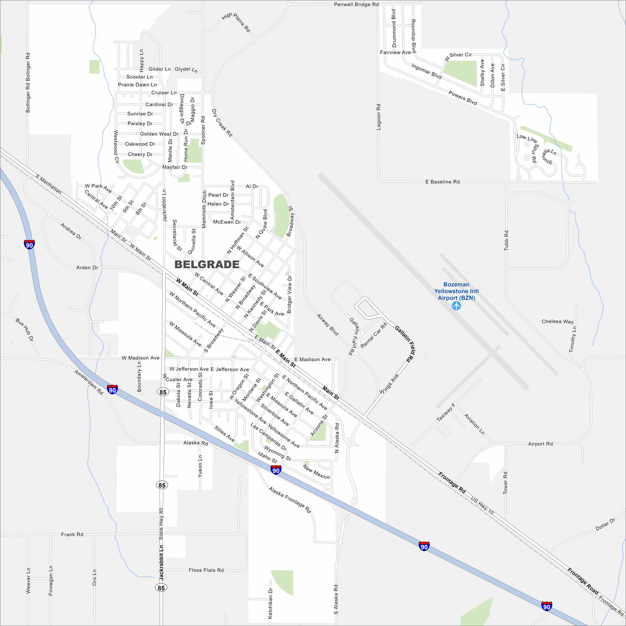 Belgrade is in southwest Montana near Bozeman. Our map highlights its roads, rivers, and parks. It’s part of the Gallatin Valley.