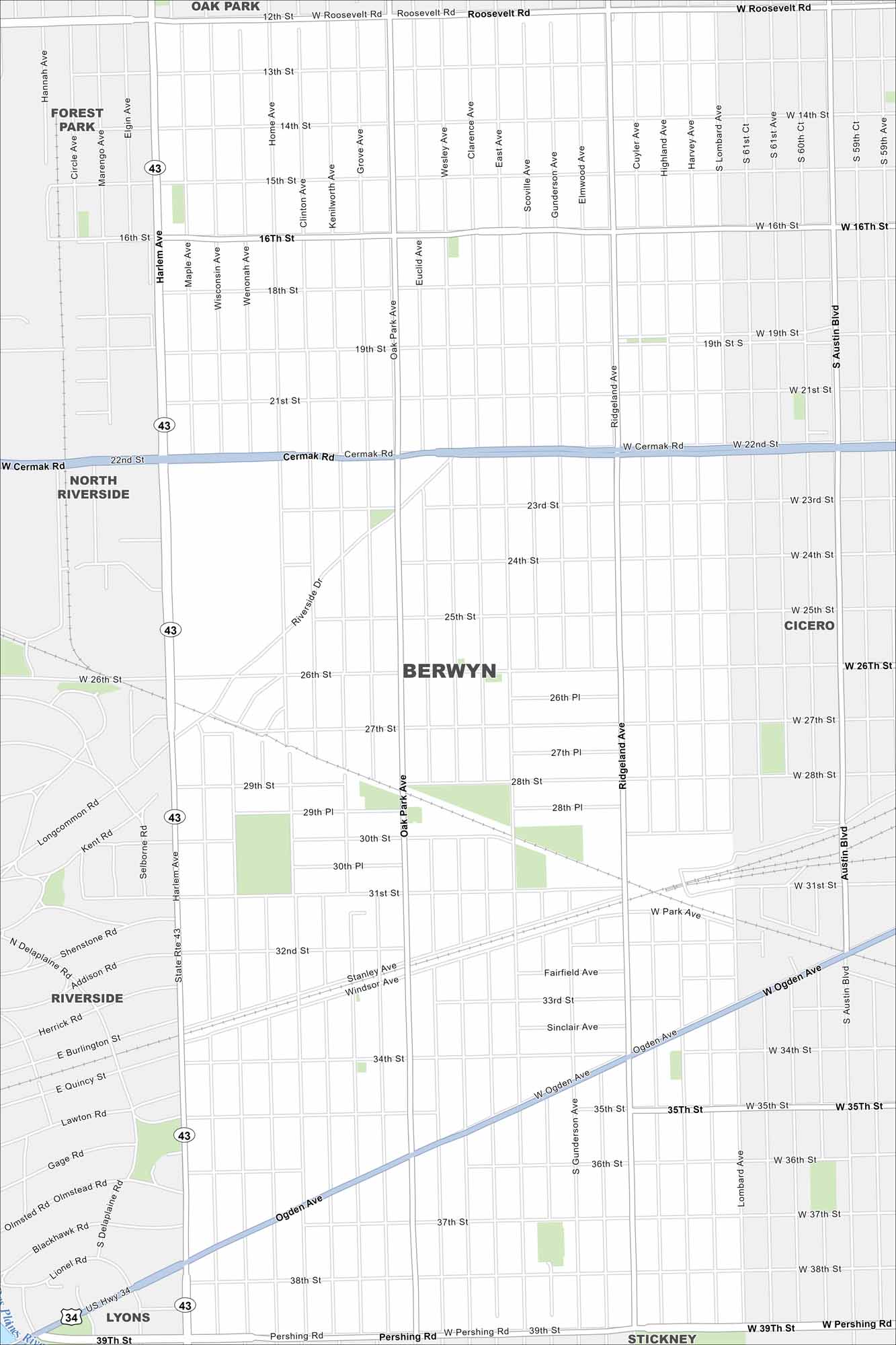 Berwyn is a near-west suburb of Chicago. Our map outlines grid-style streets, rail lines, and neighborhood parks. It’s known for its historic bungalows.
