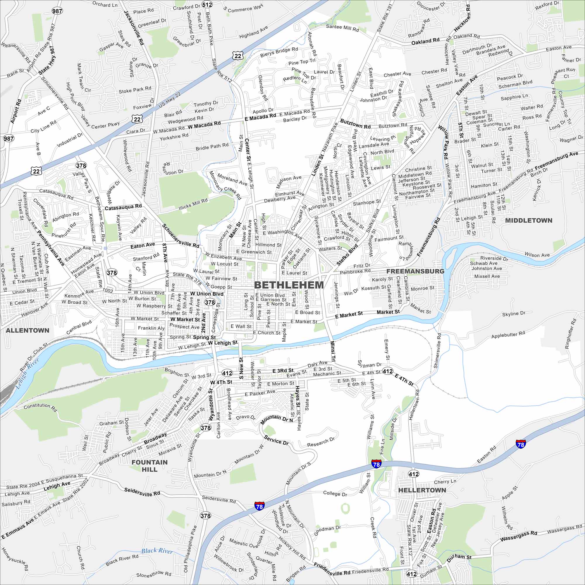 Our map of Bethlehem highlights the Lehigh River, bridges, and major highways. Neighborhood roads and green hills shape the layout. The city is often called “Christmas City” because of its Moravian roots.