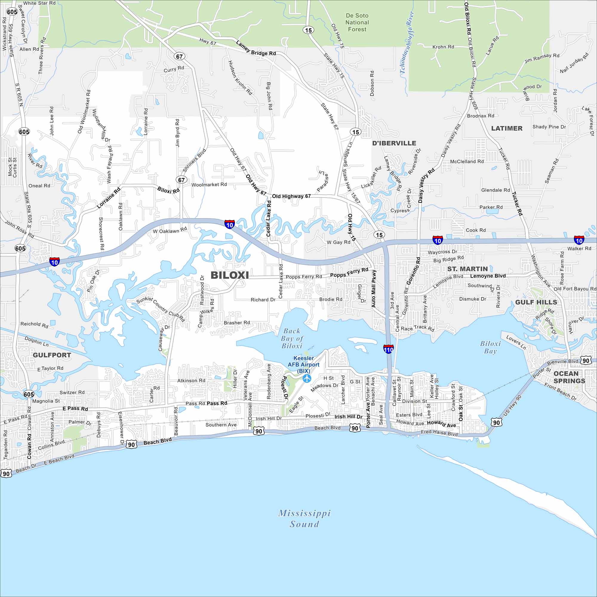 Biloxi is a Gulf Coast city with beaches and a deep maritime history. Our map highlights these features, including its roads and highways. The city is known for beaches and casinos.