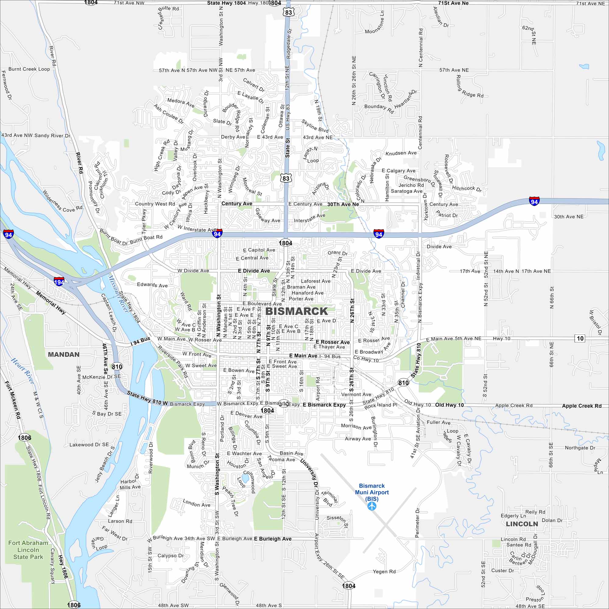 See the highways, streets, and rivers shown clearly here. Our map of Bismarck follows the Missouri River. It is the capital of North Dakota.
