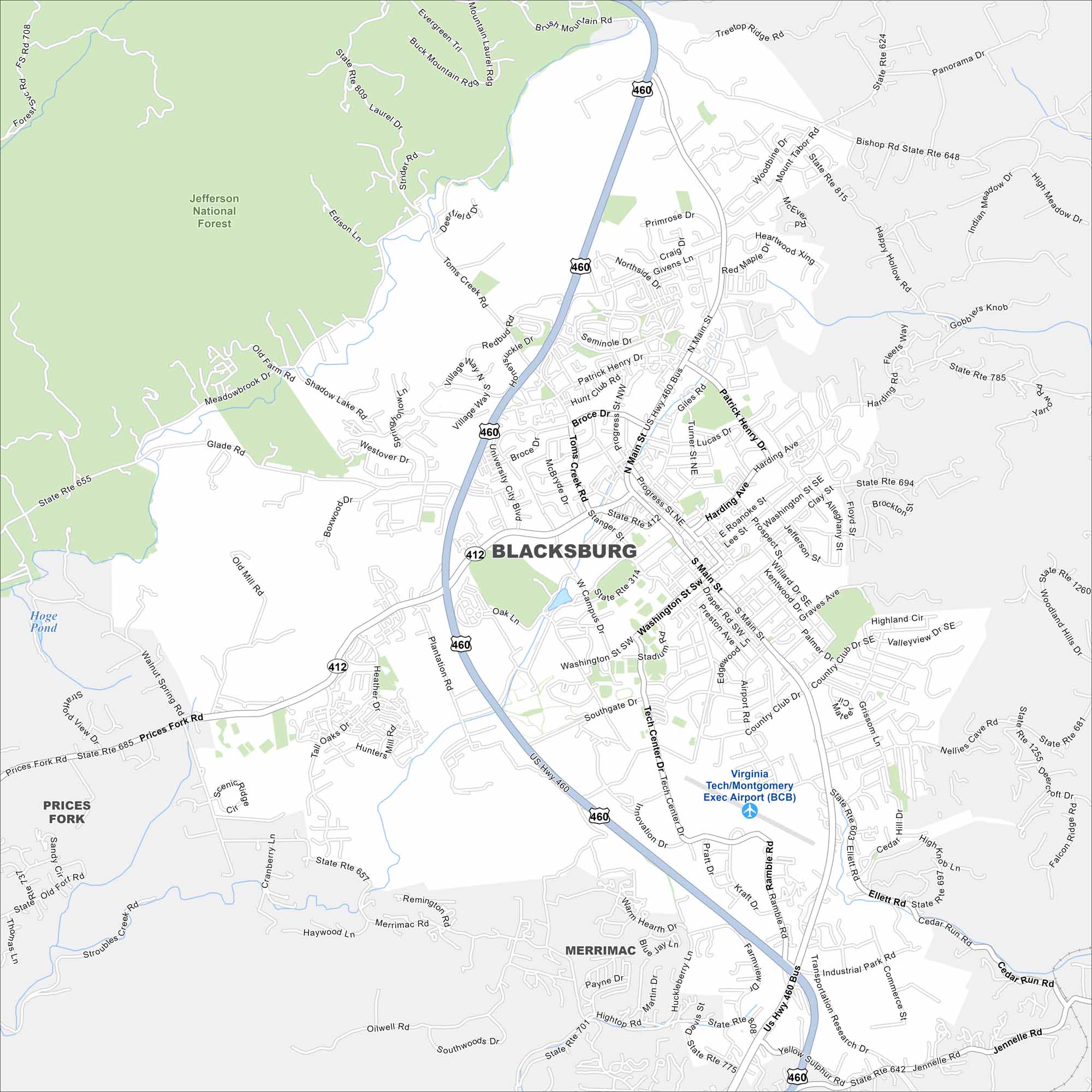 We’ve mapped Blacksburg with its streets, highways, and parks. The roads connect to the Blue Ridge. It’s best known as the home of Virginia Tech.