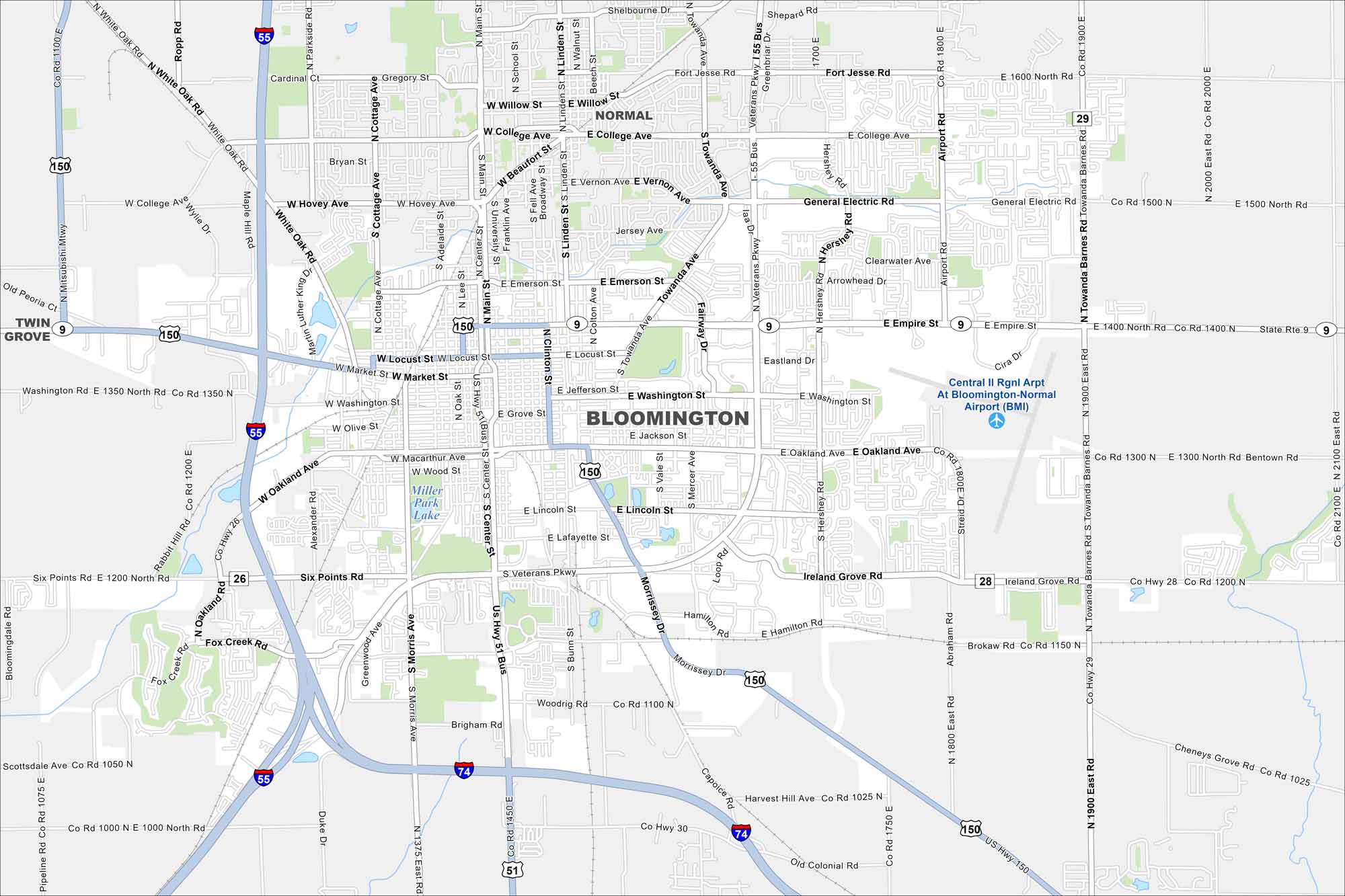 Bloomington is a central Illinois hub. Our map highlights roads, neighborhoods, and nearby parks. The city is tied to agriculture but also serves as a regional business center.