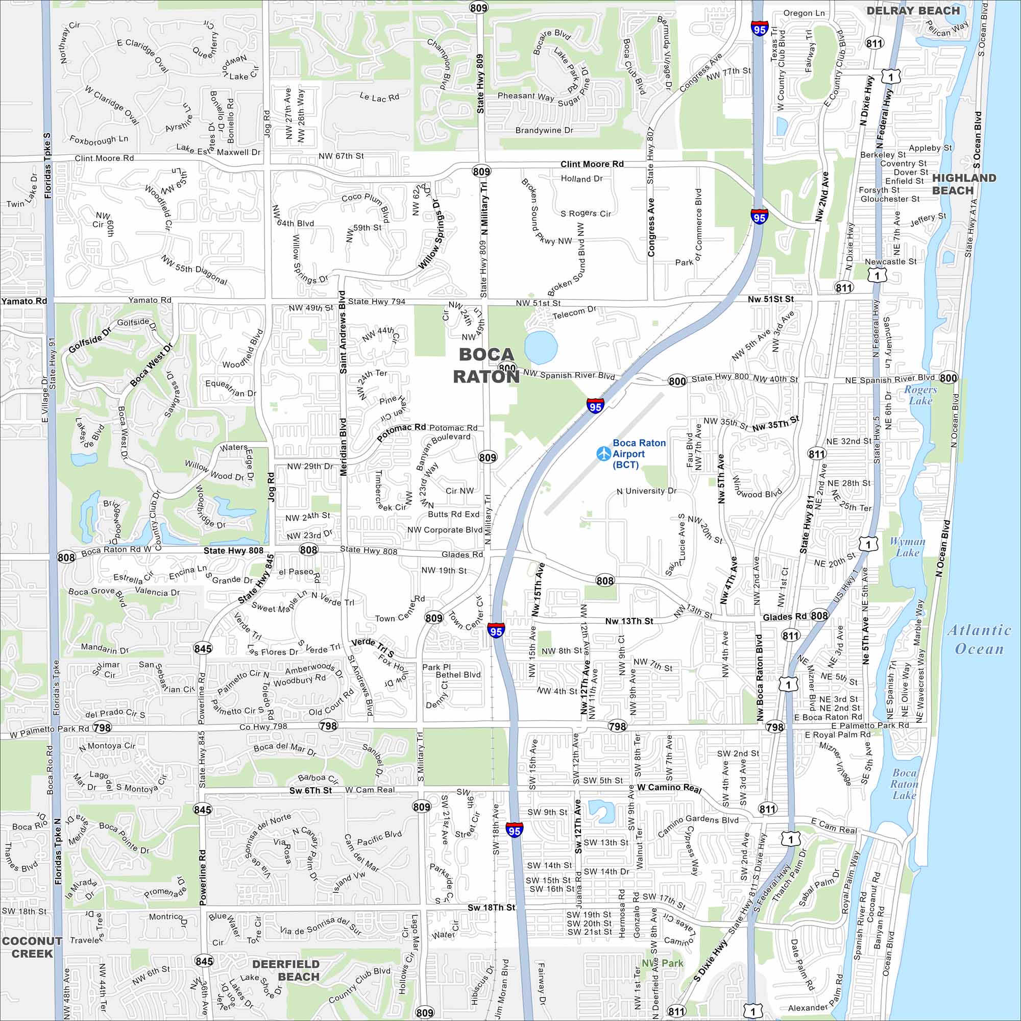 Our map of Boca Raton, Florida lays out the highways, streets, and waterways. Roads stretch along the Atlantic coast. Boca Raton is famous for its beaches and luxury living.