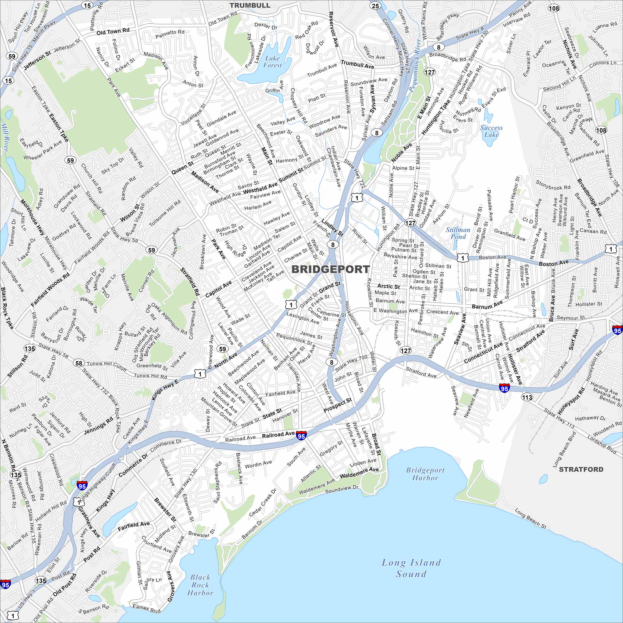 Our map of Bridgeport highlights its spot on Long Island Sound. Industry once defined the city, but parks and waterfront access give it balance. It remains Connecticut’s largest city.