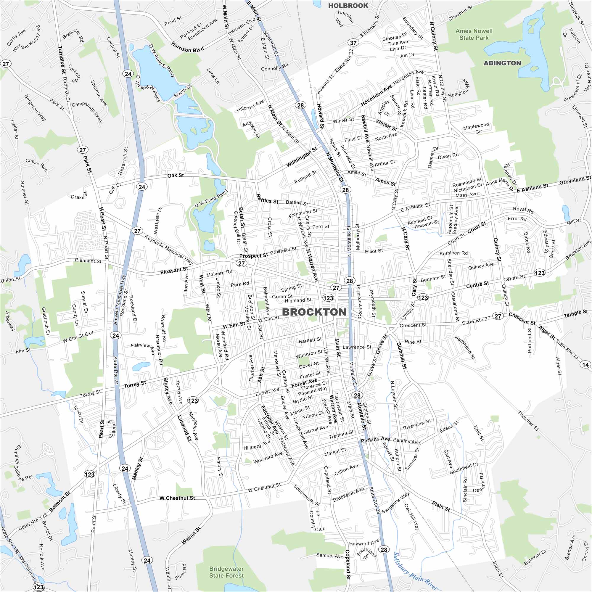 Brockton is south of Boston, long known as the City of Champions. Our map shows dense neighborhoods mixed with parks. It’s known for its proud sports and boxing history.