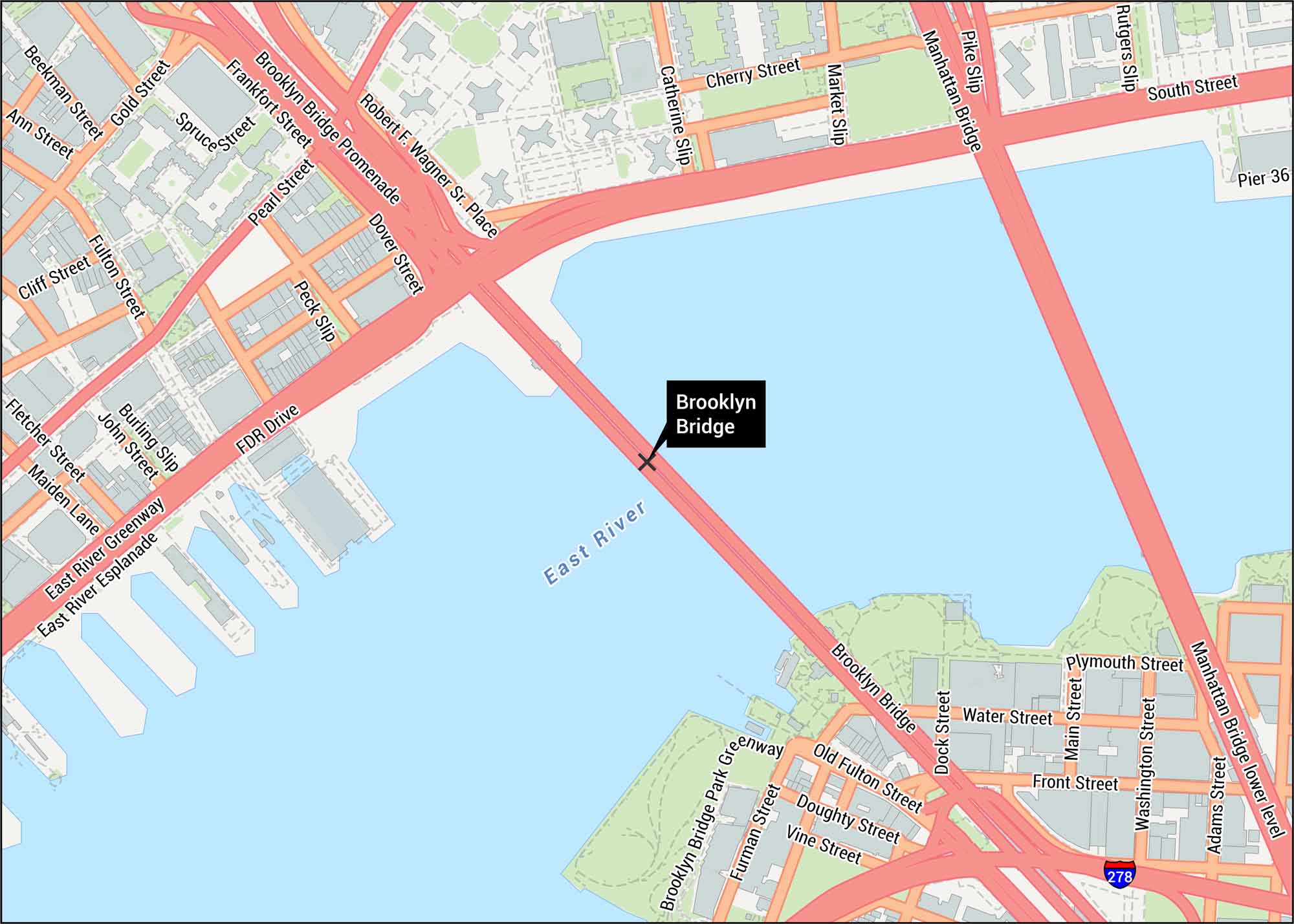 Explore our detailed Brooklyn Bridge map. The bridge itself spans the East River between Manhattan and Brooklyn. Our map shows roads, highways, walkways and piers.