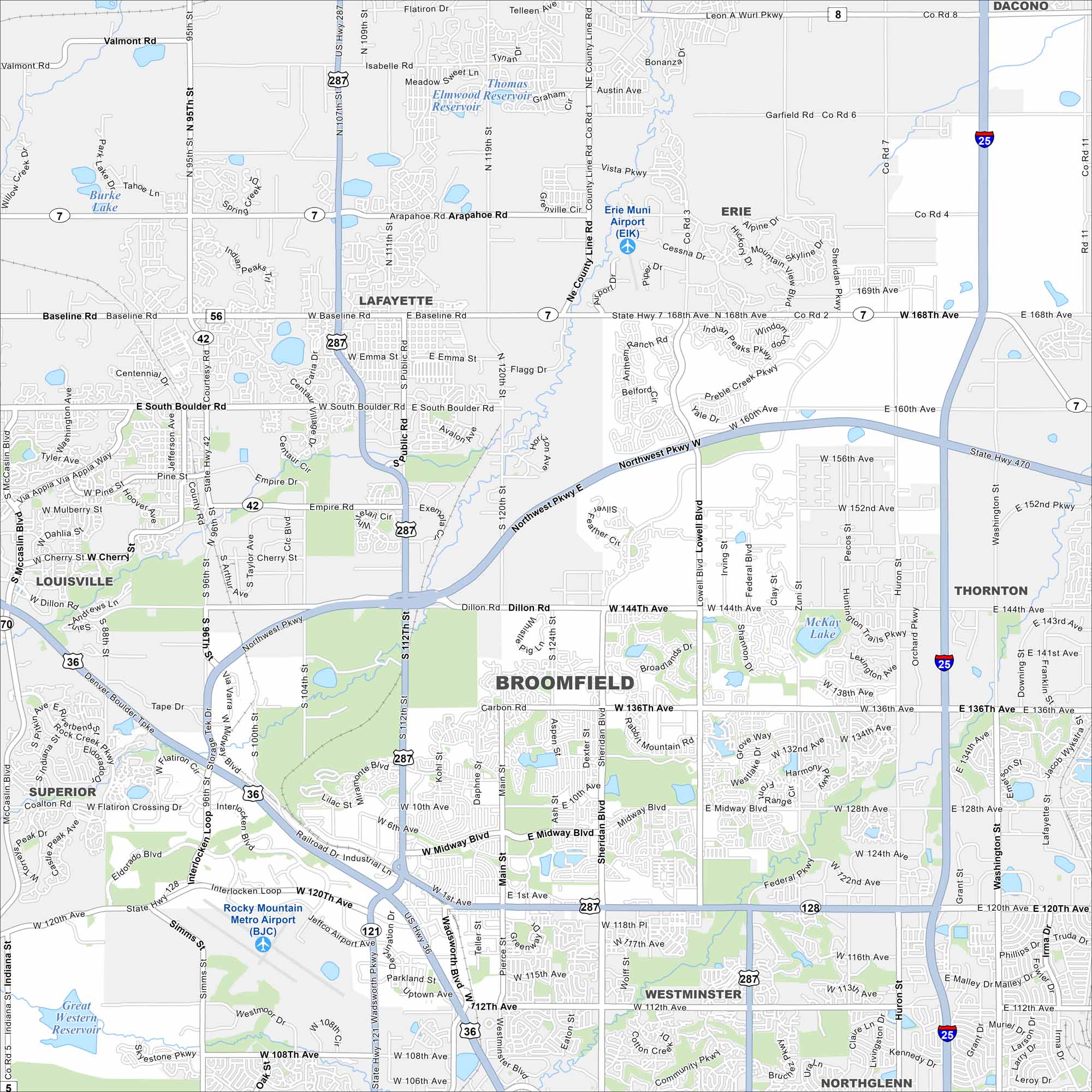See Broomfield on our map, spread between Denver and Boulder. Highways pass through, but open space and trails are easy to spot. Its location makes it a natural connector in the Front Range.
