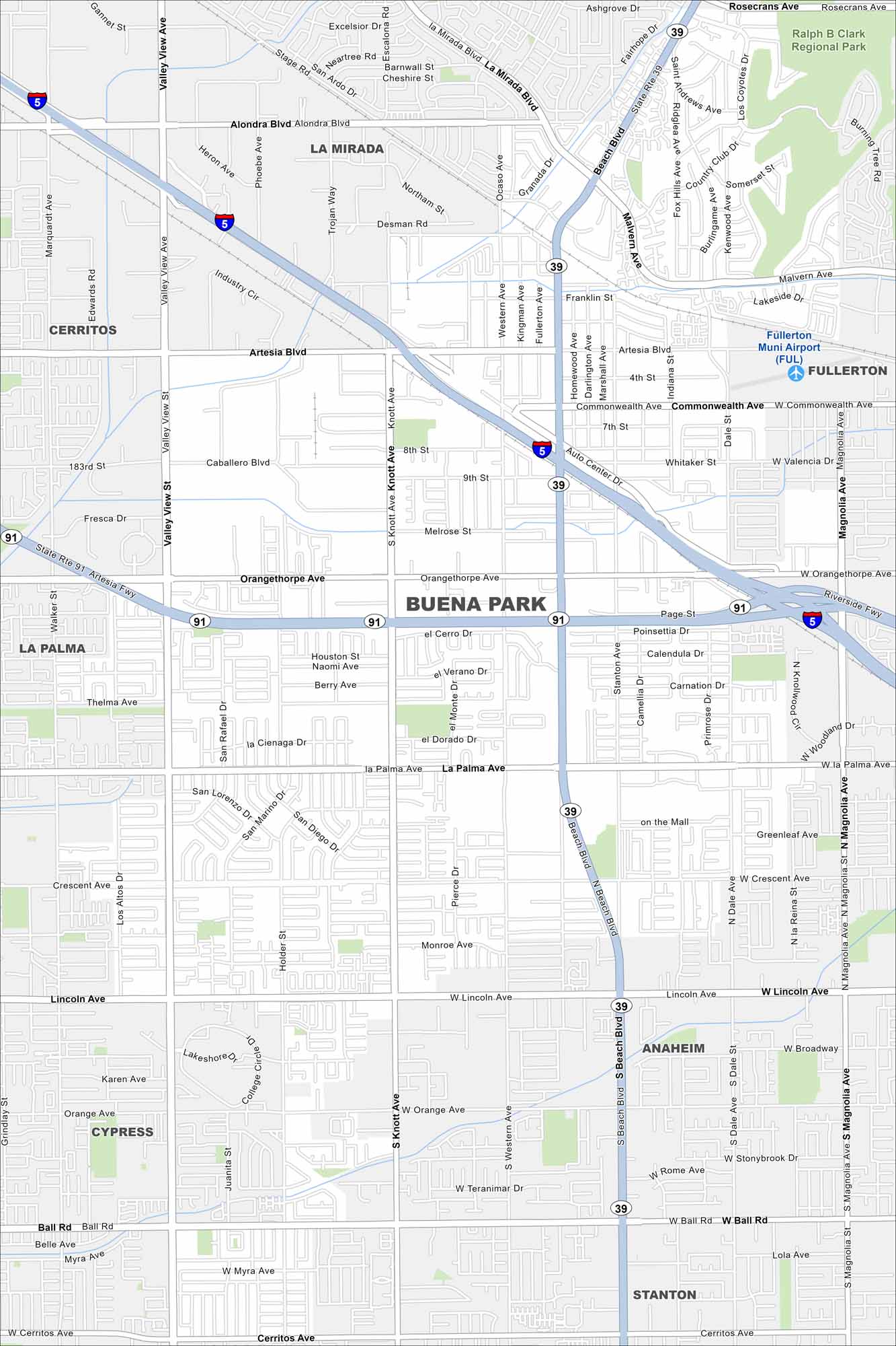 See the highways, streets, and park areas laid out here. Our map of Buena Park highlights its roads and open spaces. The city is known for Knott’s Berry Farm and its location in northern Orange County.