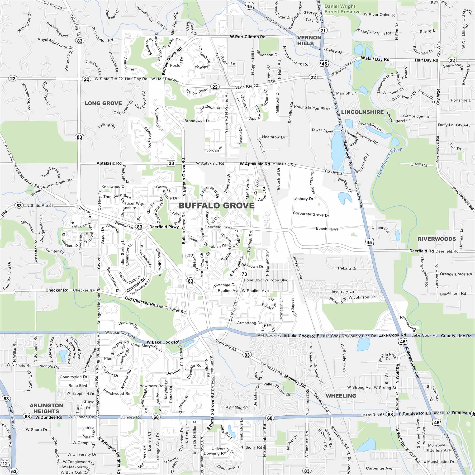Explore Buffalo Grove with our map, containing roads, parks and lakes. It lies northwest of Chicago. The Des Plaines River is nearby, but much of the city is suburban neighborhoods.