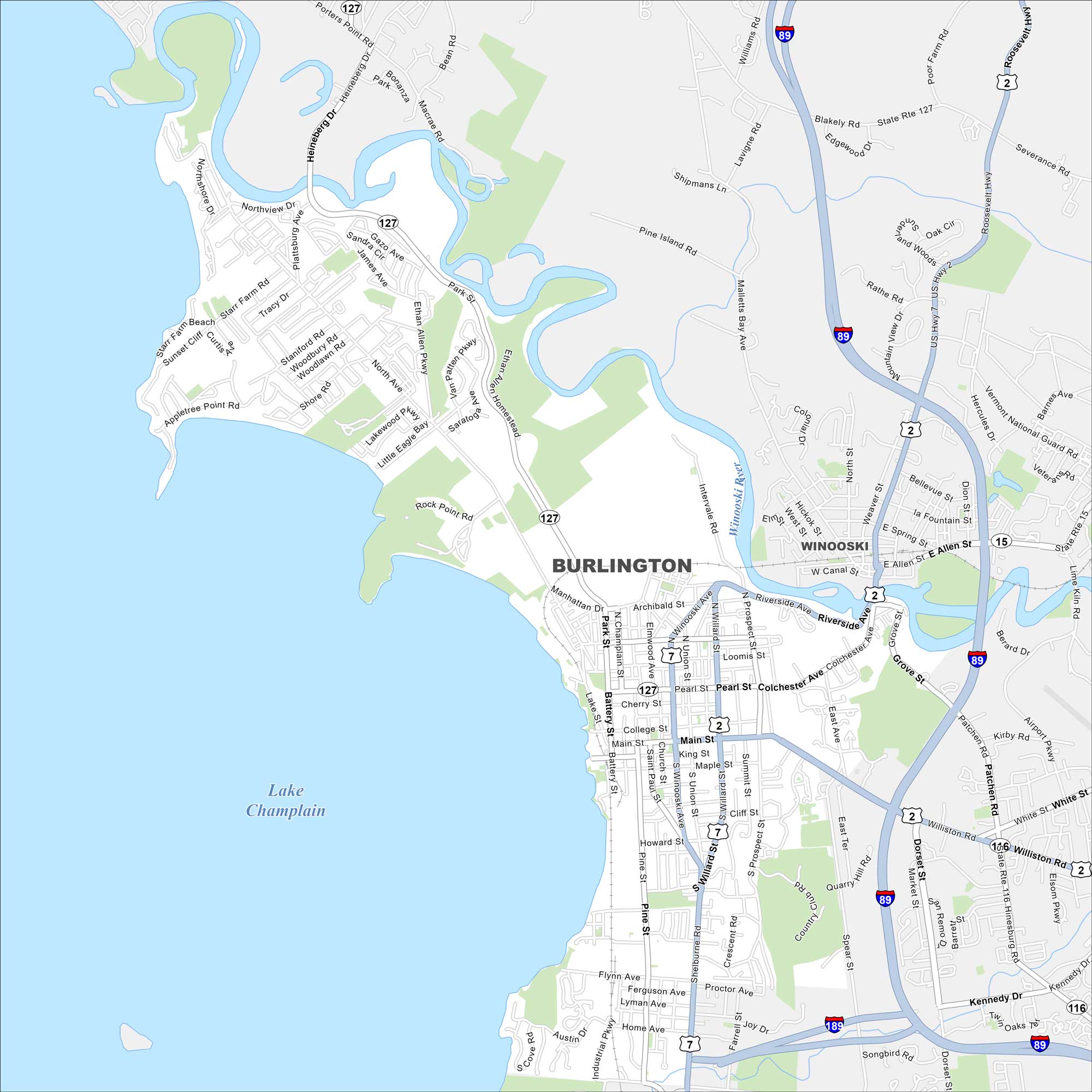 Burlington is set on the eastern shore of Lake Champlain. Our map shows its waterfront parks, highways and the Winooski River. The city is often called Vermont’s Queen City and is the largest in the state.