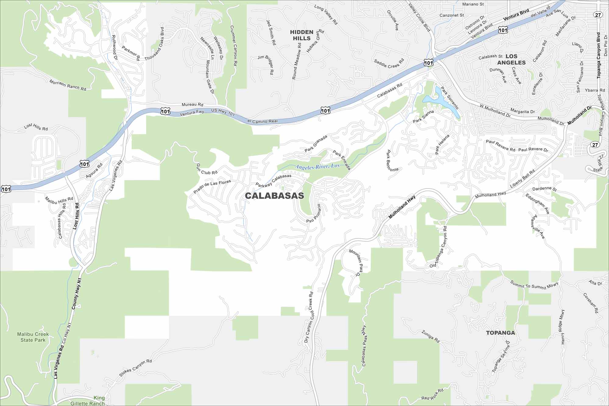 Explore Calabasas with our map, where neighborhoods wind through the Santa Monica Mountains. Roads curve instead of form grids because of the hills. The terrain gives it a peaceful and secluded feel.