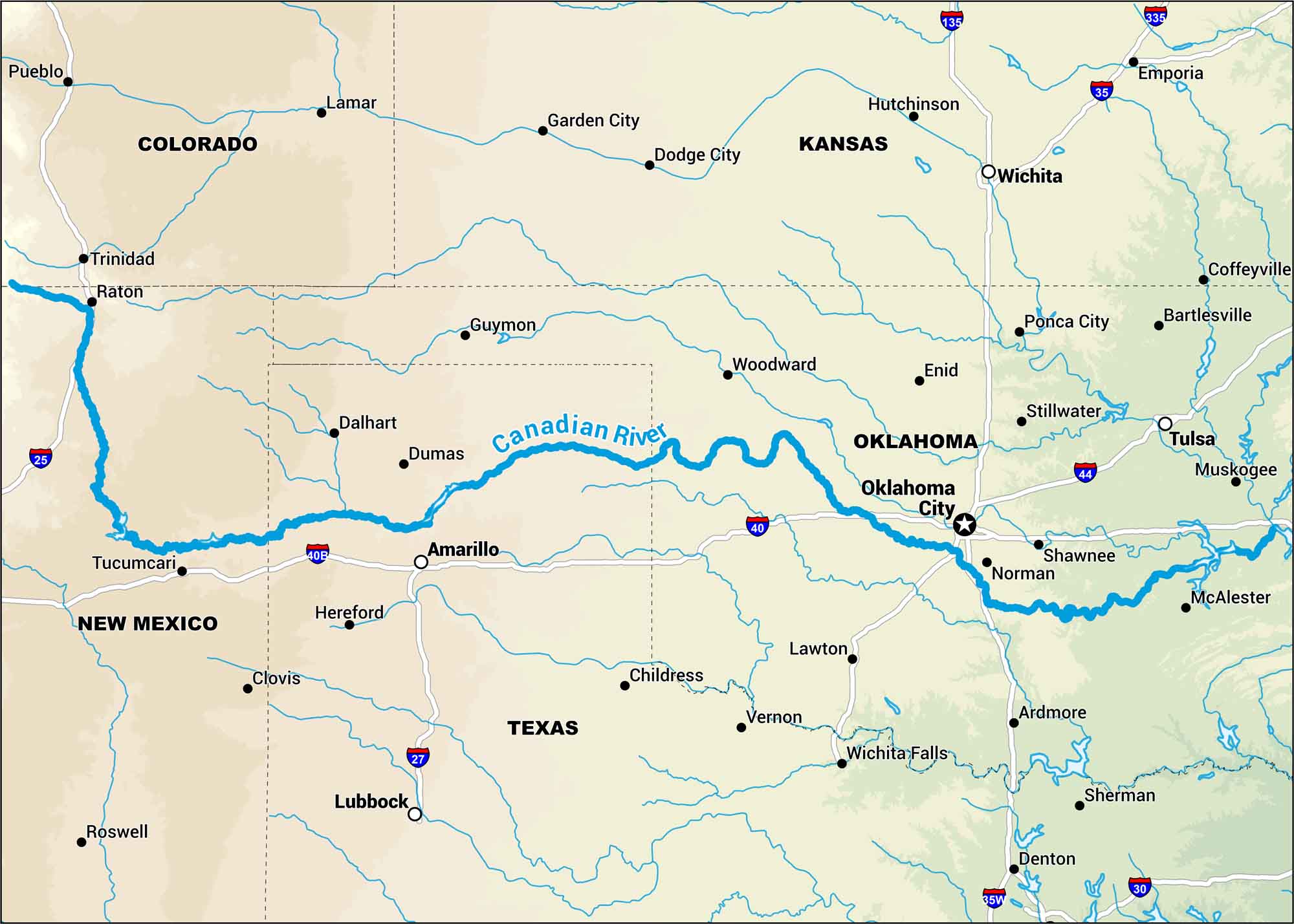 Don’t look north to Canada for the Canadian River. This one spans New Mexico. Texas. And Oklahoma. Our map gets you familiar as it flows across the plains. Few towns, fewer trees. Just that long river of the Southwest.