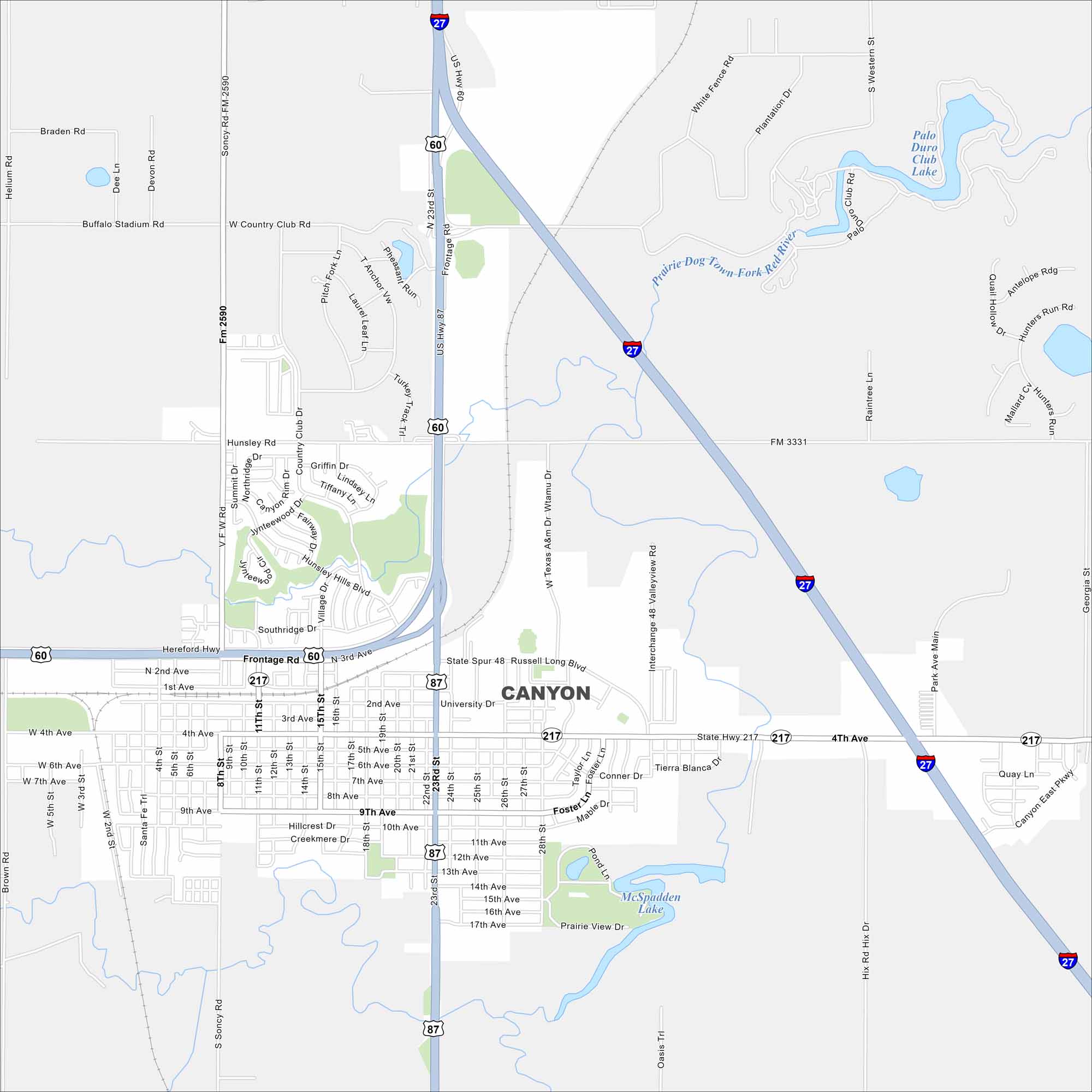 Check out Canyon, Texas on our map. It’s a Panhandle town south of Amarillo. The streets are simple, but the nearby Palo Duro Canyon is the real landmark. It’s often called the “Gateway to Palo Duro” because of that.