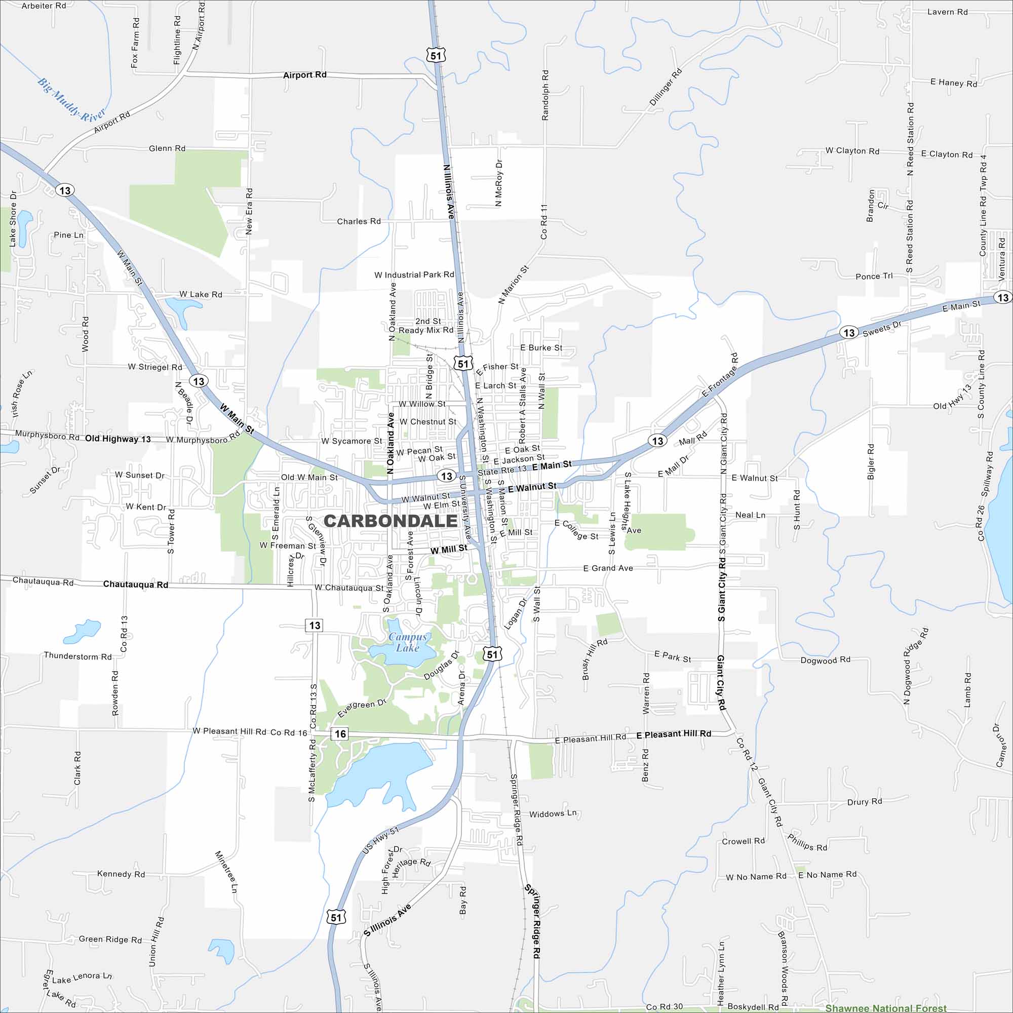 Carbondale is in southern Illinois near the Shawnee National Forest. Our map highlights neighborhoods, surrounding green hills, and nearby lakes. The city is sometimes called the “Capital of Southern Illinois” because it anchors the region.