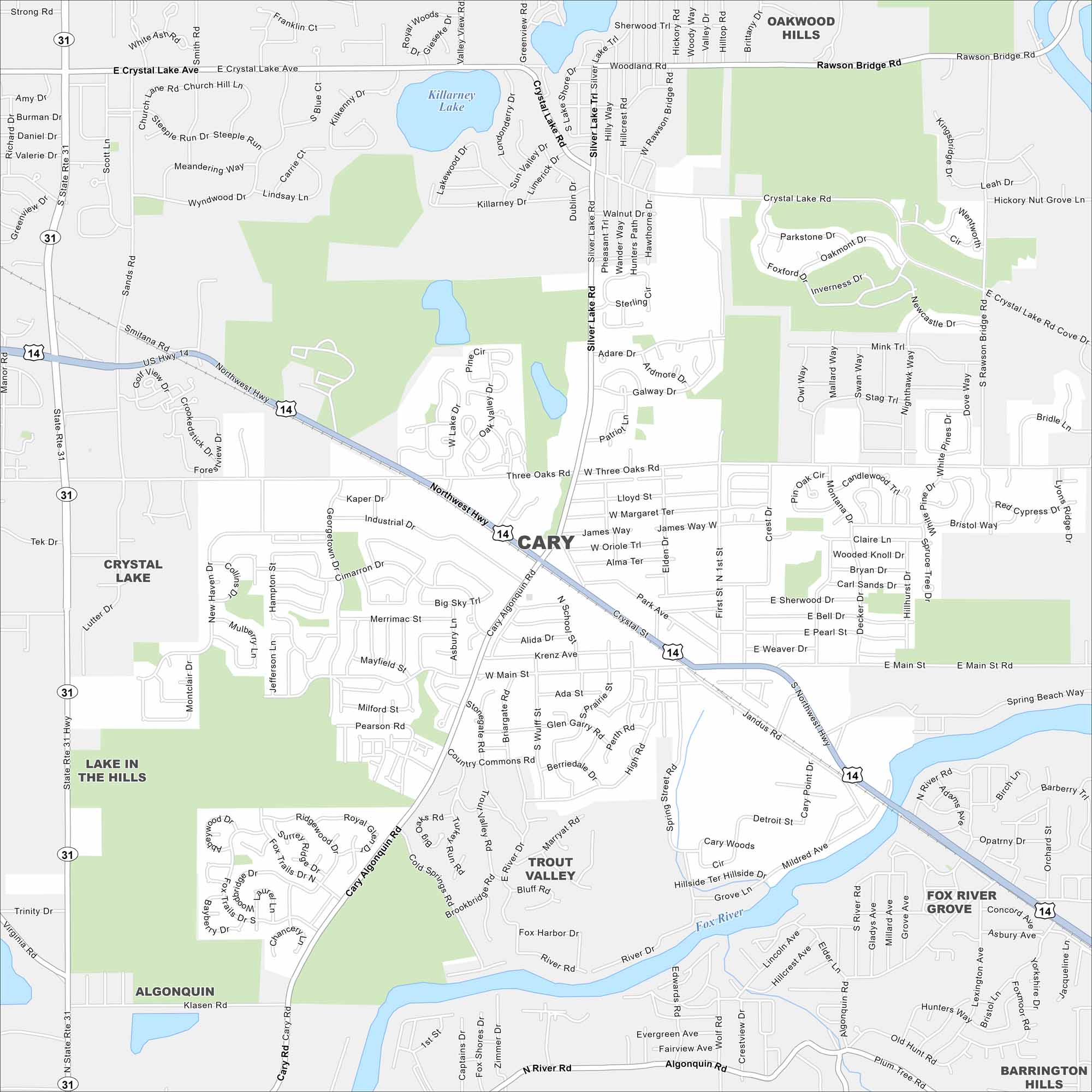 Explore Cary with our map, a village in northern Illinois. It sits along the Fox River with a mix of residential streets and green spaces.