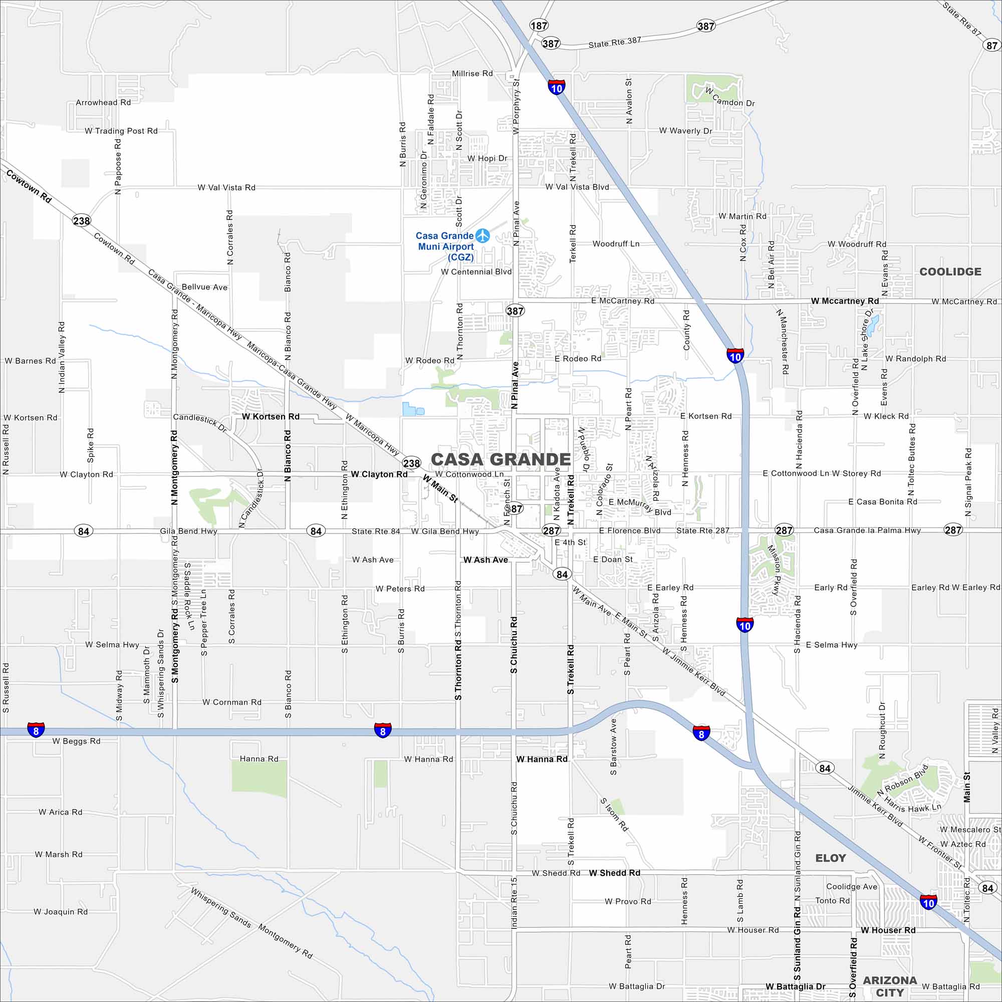 Our map of Casa Grande shows a desert city between Phoenix and Tucson. The city spreads across flat desert with mountain views in the distance. It’s especially known for the historic Casa Grande Ruins.