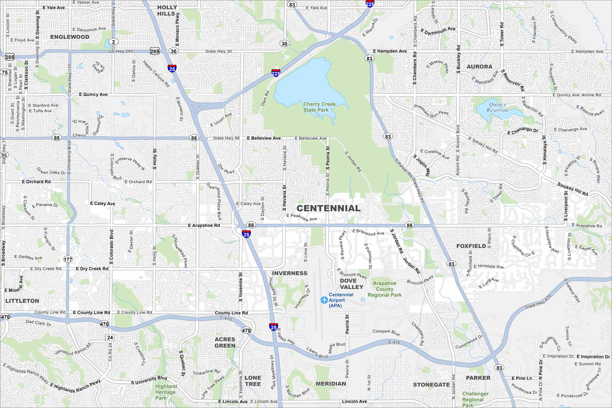 Centennial is a suburban city in the Denver metro. Our map highlights winding streets, open parks, and major roadways.