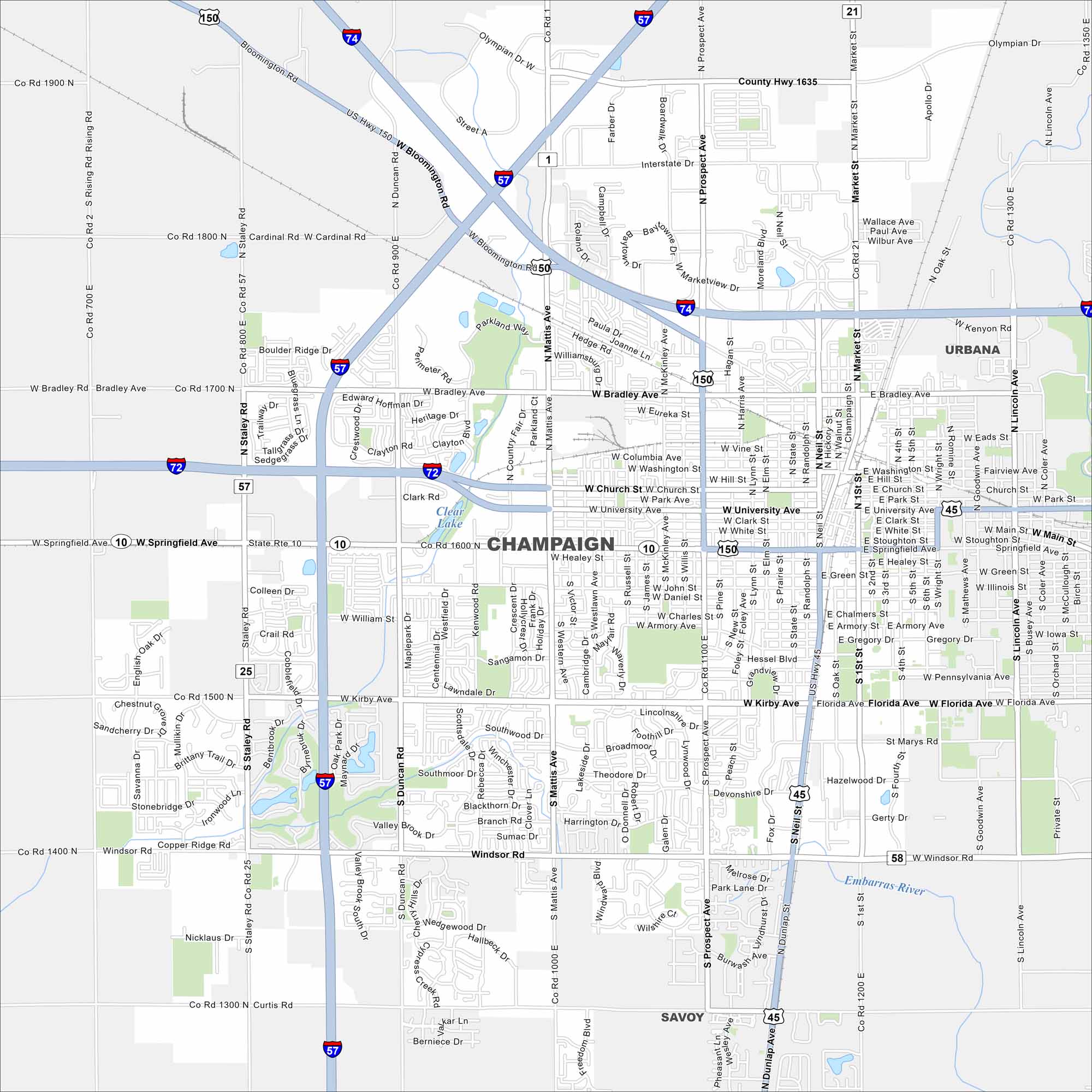 Champaign is surrounded by vast farmland. Our map shows its neighborhoods spreading outward from a lively downtown. It thrives with the University of Illinois anchoring the community.