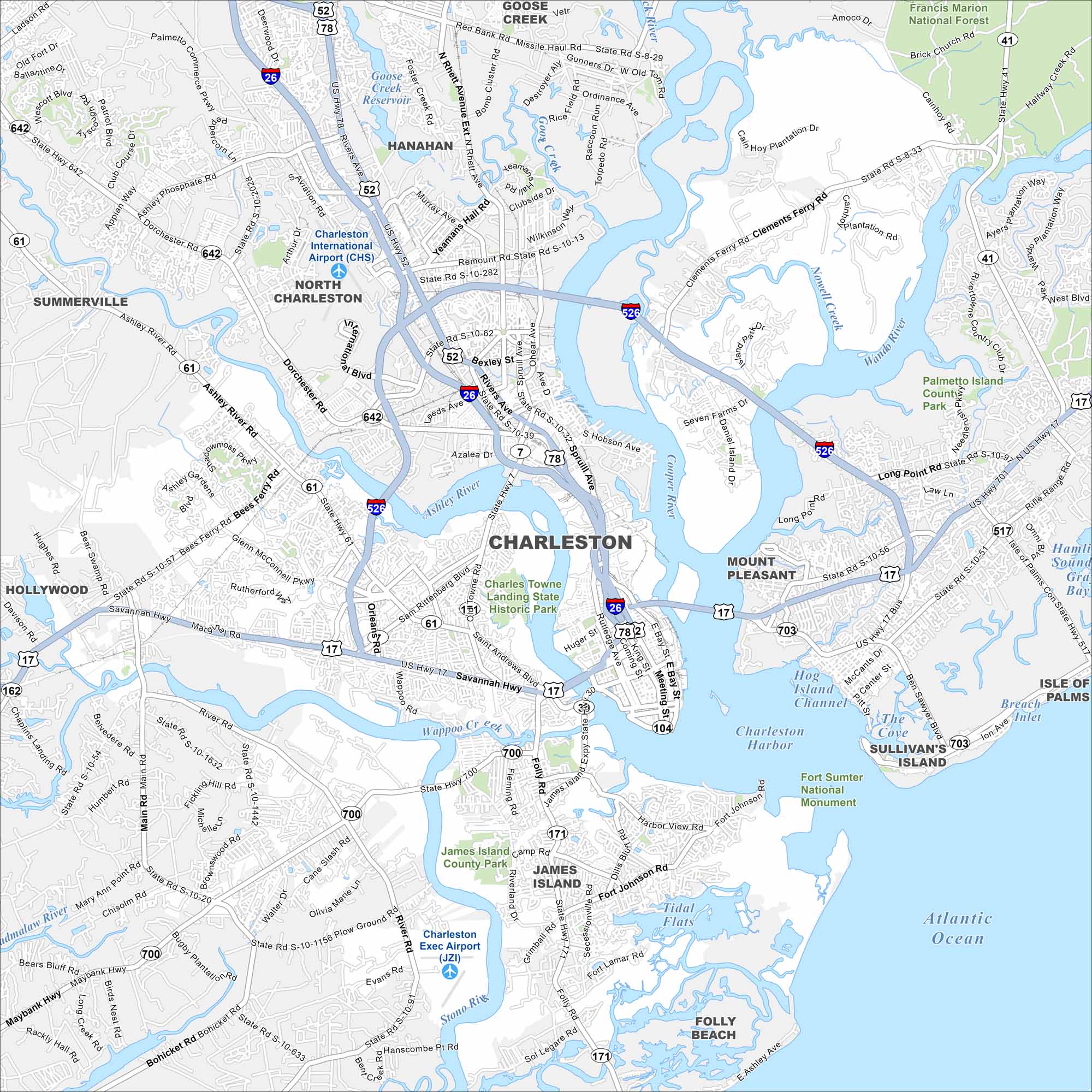Our map of Charleston highlights the peninsula, waterways, and historic districts. Known as the “Holy City”, it sits where the Ashley and Cooper Rivers meet. The Atlantic coastline shapes much of its character.