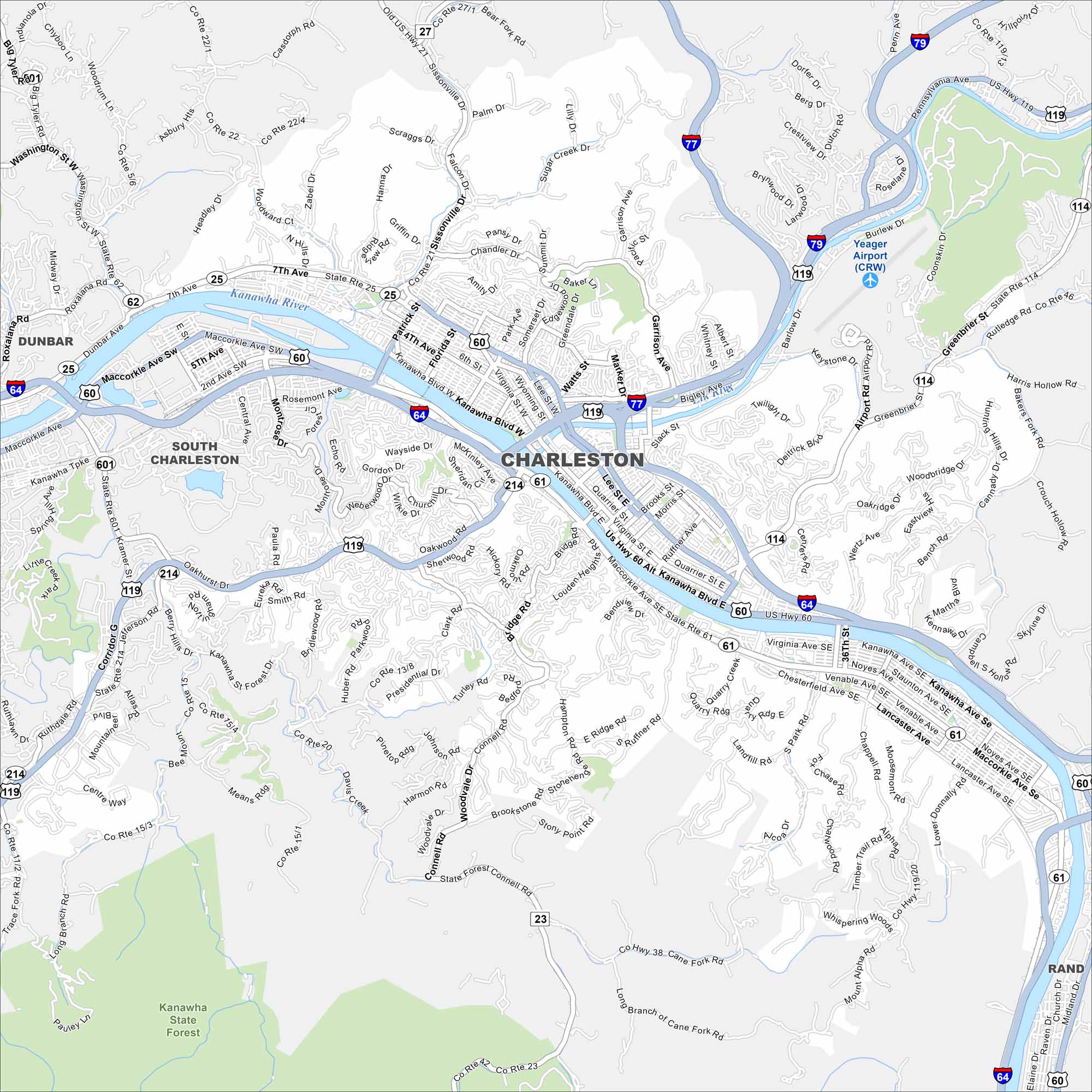 Charleston is shown with the Kanawha River winding through its center and highways crossing the valley. As the state capital, it’s surrounded by rolling Appalachian hills. The rivers are the city’s natural spine.