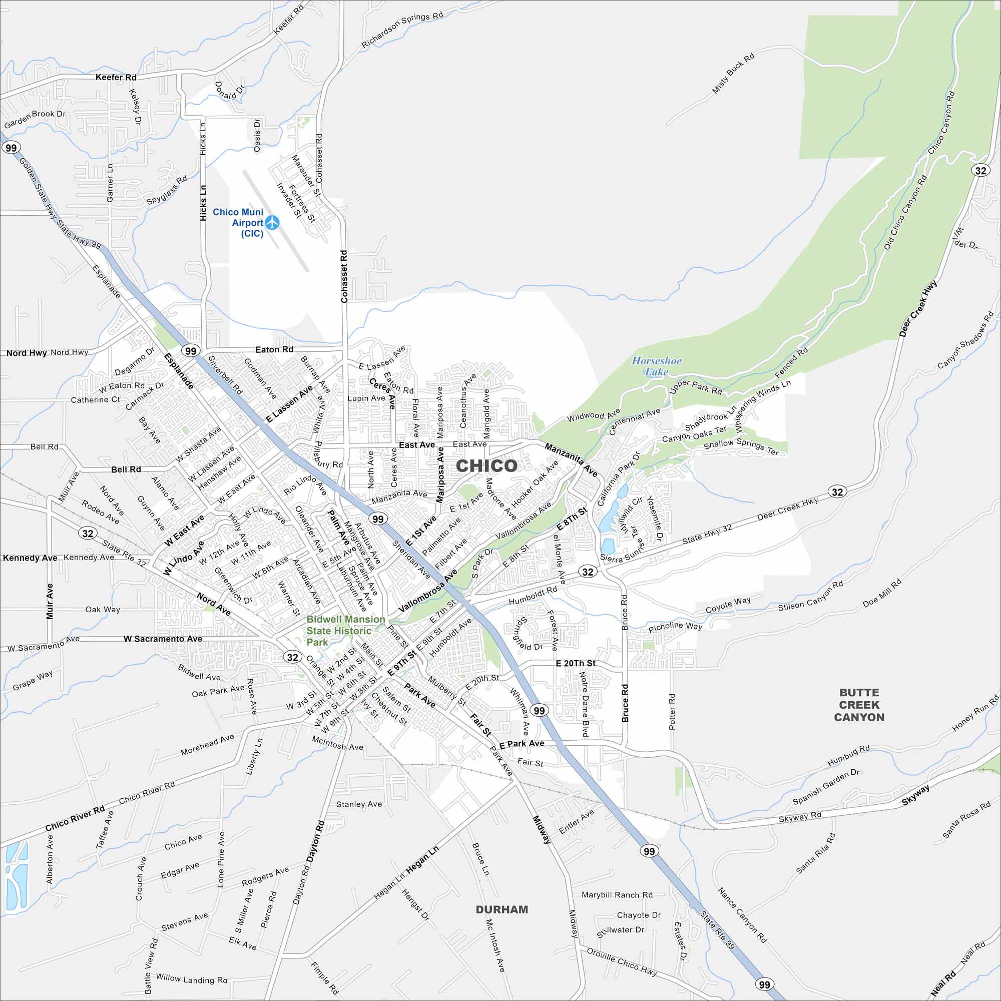 Here’s our map of Chico, California. Our map contains roads, waterways, and the nearby park system. Home to Bidwell Park, it’s one of the largest urban parks in the U.S.