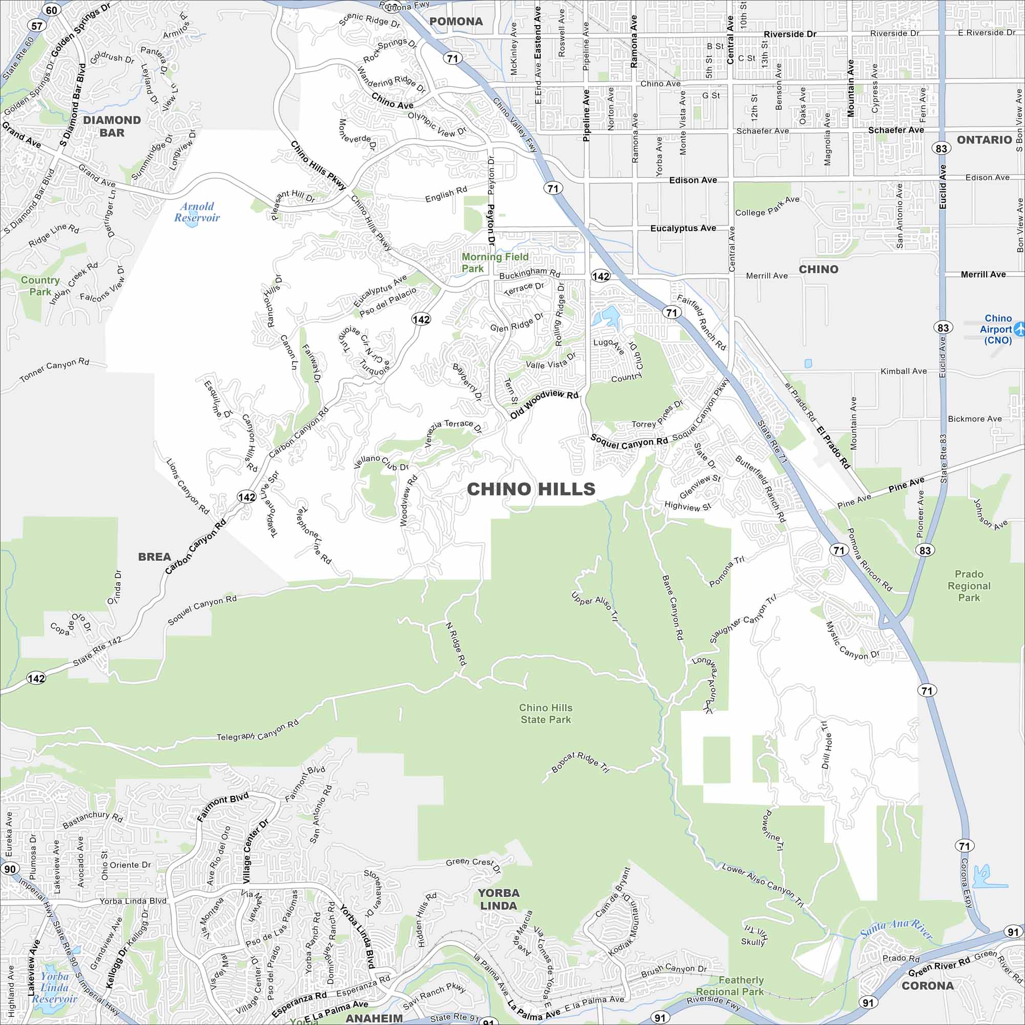 See our map of Chino Hills with its streets, highways, and parkland. This city is set among rolling hills on the edge of the Inland Empire.