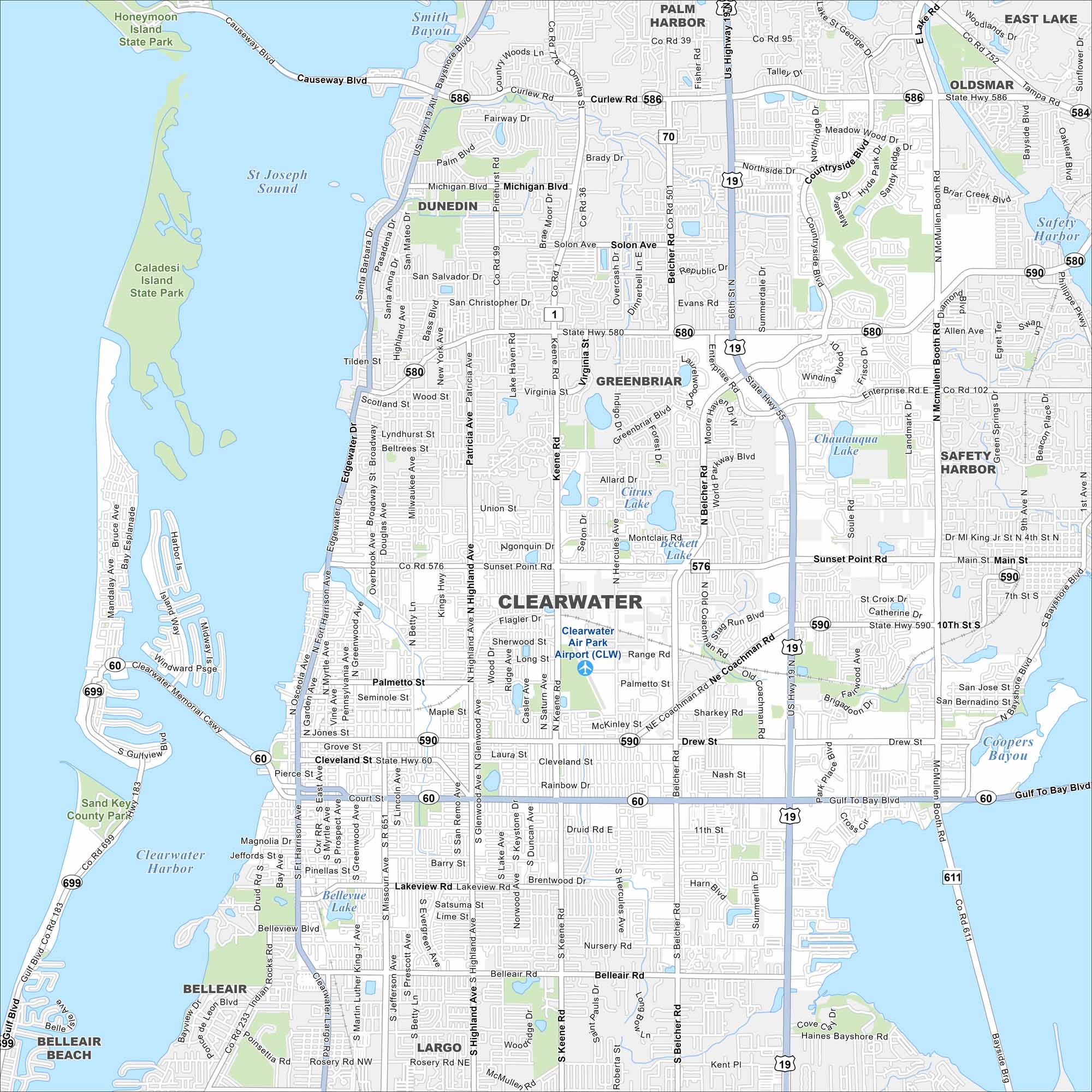 Our map of Clearwater shows streets, highways, and coastal routes. The city is known for its Gulf beaches and barrier islands. Situated west of Tampa, the Intracoastal Waterway divides the shoreline.