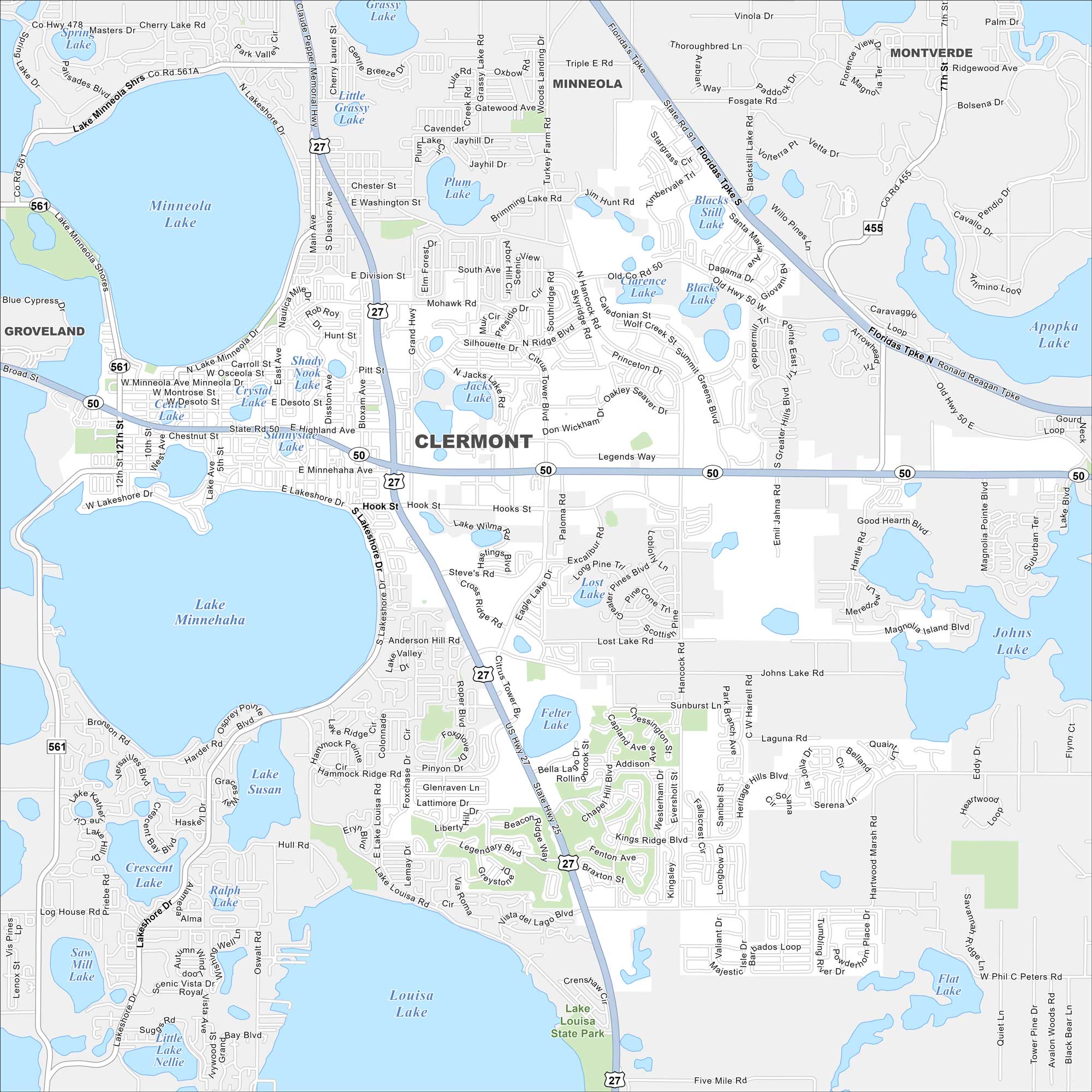 Clermont is mapped with its roads, highways, and nearby lakes. West of Orlando, the city is known for its rolling hills. Lake Minneola shapes the heart of town.