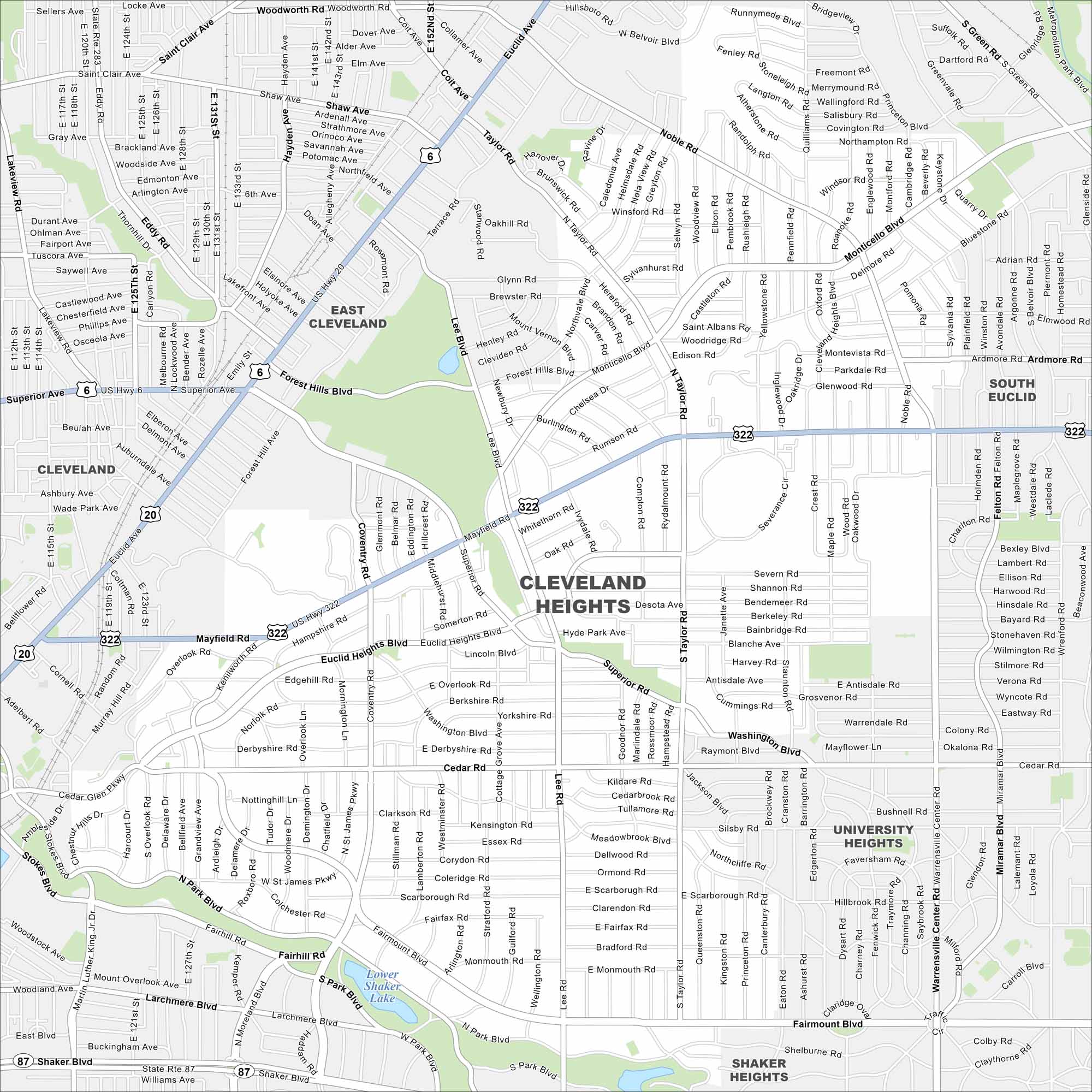 Cleveland Heights spreads east of downtown. The community is known for tree-lined neighborhoods. Its elevation changes give the city its name.