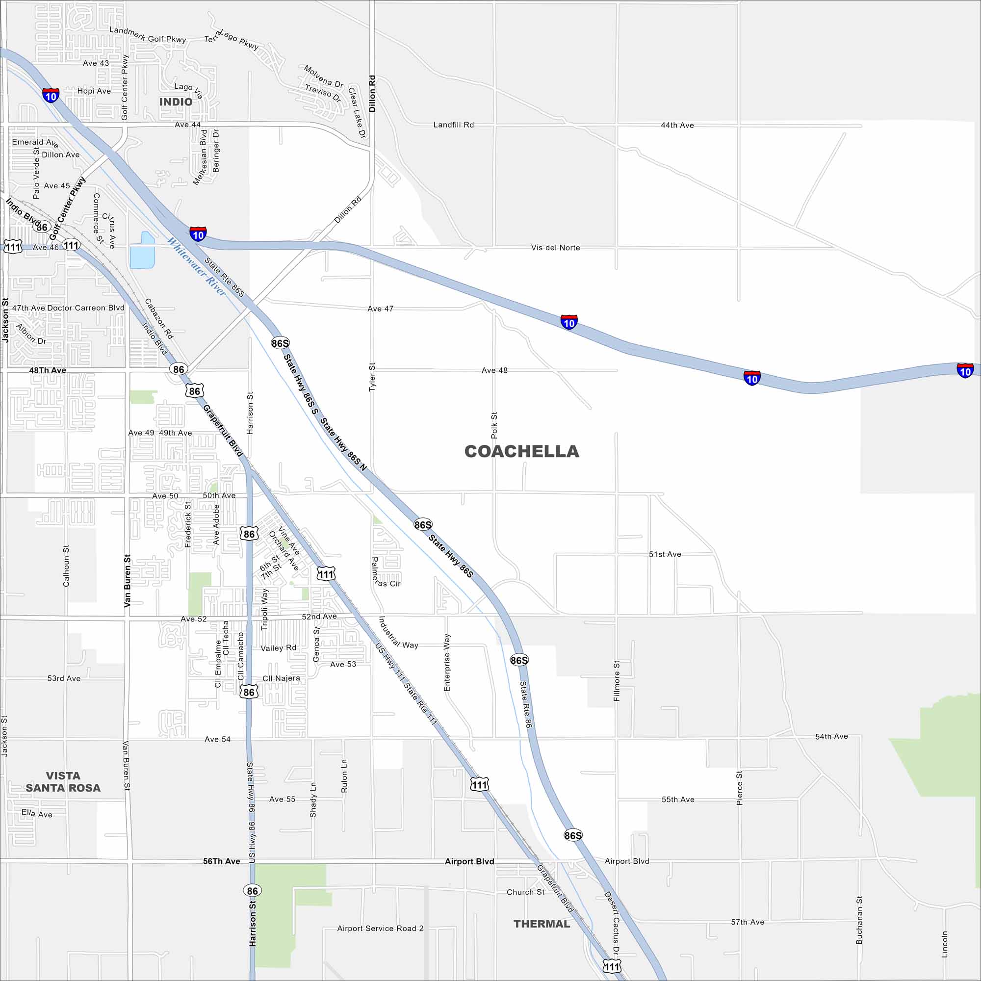 Coachella sits in the flat Coachella Valley with streets running straight across farmland. The city is famous for music festivals and is backed by the surrounding desert mountains.