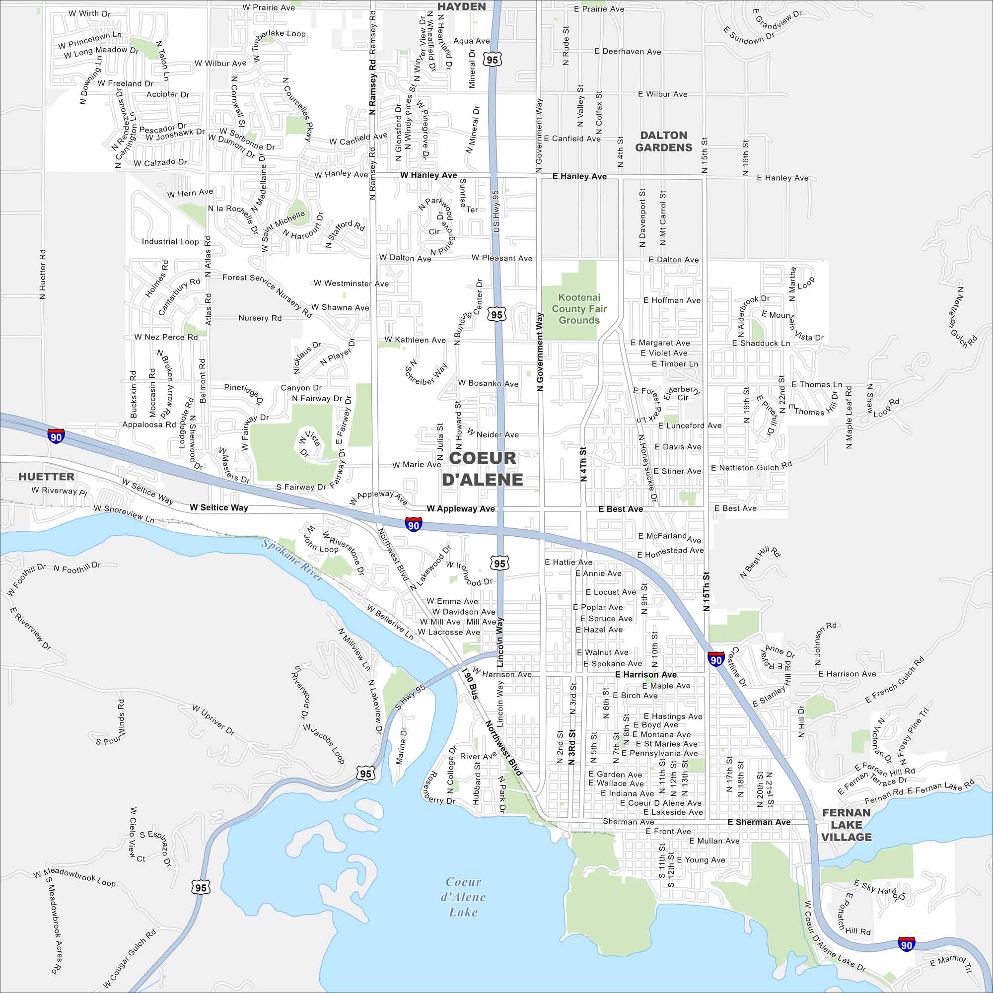 Our map of Coeur d’Alene shows the city’s streets, highways, and lakefront. Nestled in northern Idaho, it’s famous for its namesake lake and surrounding mountains. Forests and trails spread right to the edge of town.
