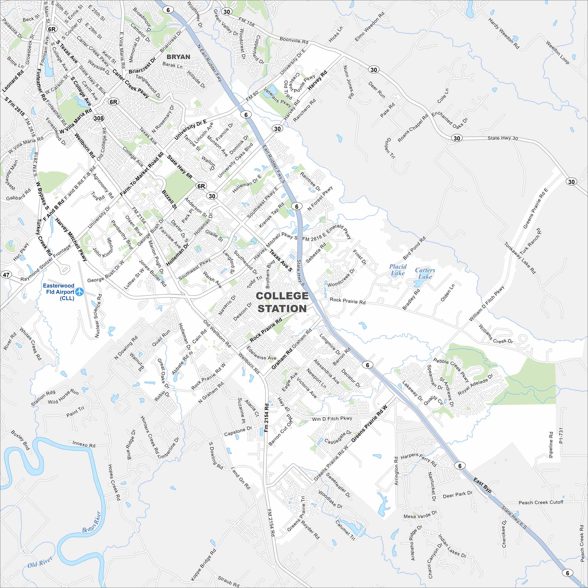 College Station centers on Texas A&M University. The city grew around the campus and spreads across the flat Brazos Valley. Farmland are around on its edges.
