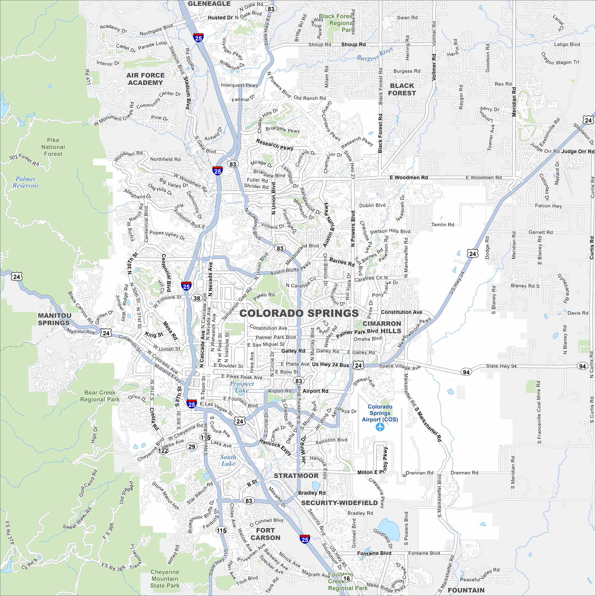 Colorado Springs is situated at the foot of Pikes Peak so the city is surrounded by quite the scenery. The Garden of the Gods sits just west of downtown. Our map shows its streets, highways, and state parks/forests.