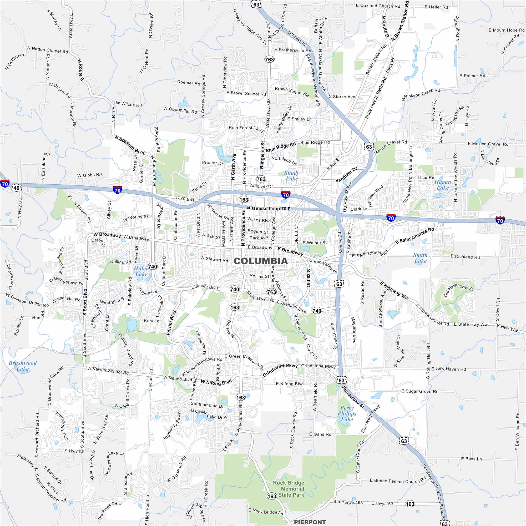 Our map of Columbia shows the layout of streets, highways, and surrounding countryside. Between Kansas City and St. Louis, this city is home to the University of Missouri. Rolling farmland is a key feature of the region.