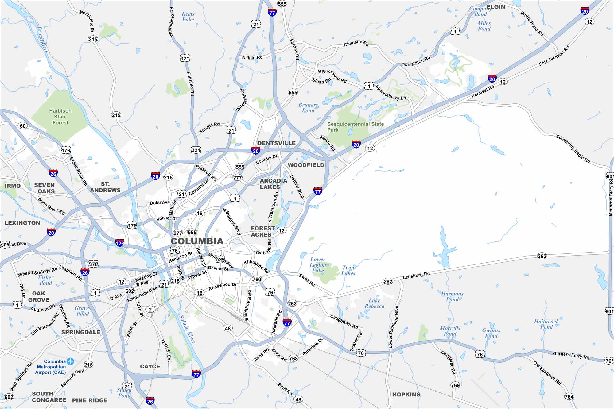 See our map of Columbia with its highways and rivers. As South Carolina’s capital, it sits where the Broad and Saluda Rivers join to form the Congaree. The city mixes history with a central location.