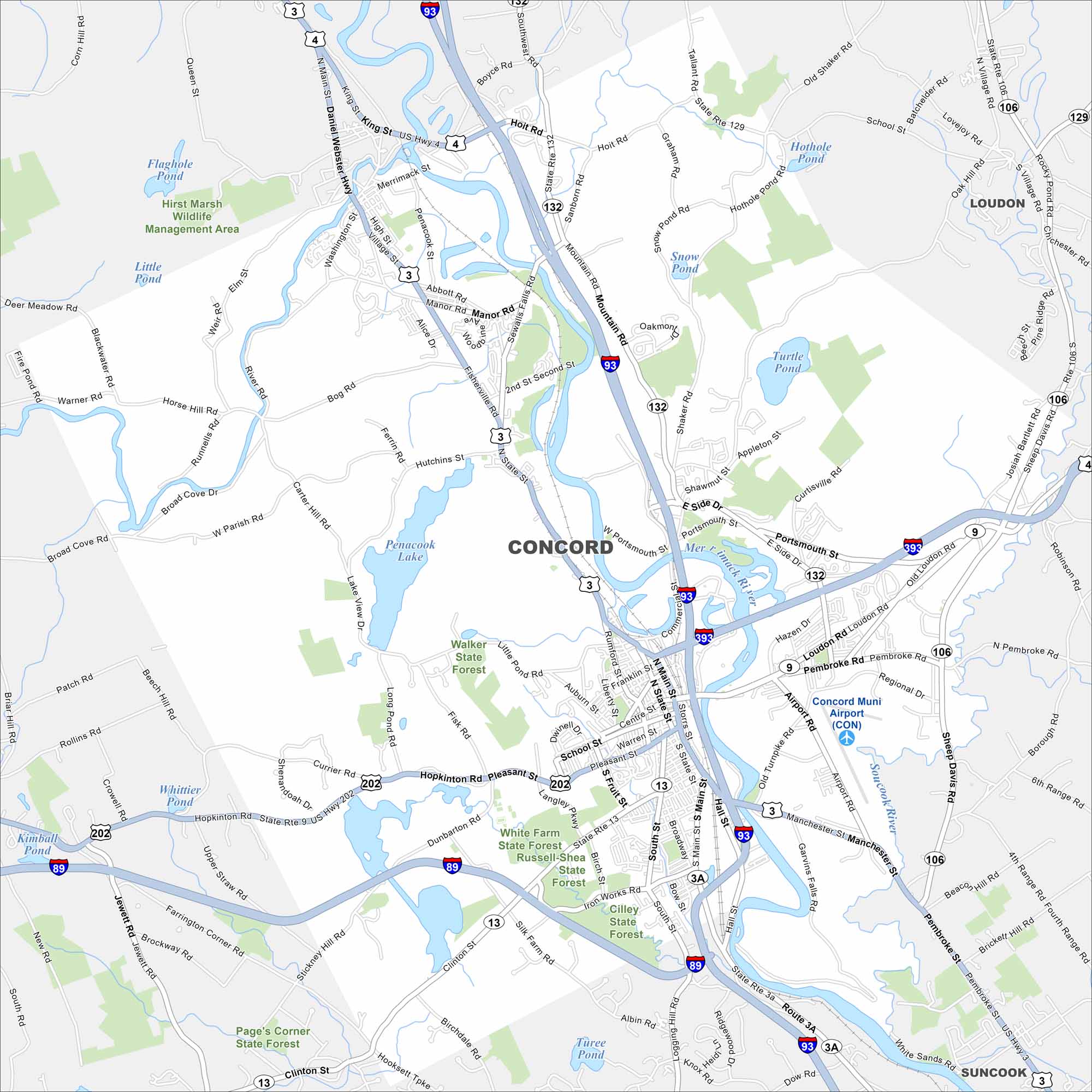 Concord is shown with Interstates 93 and 89 running through the city. As the state capital, it stands on the Merrimack River. Rolling New England hills surround the area.